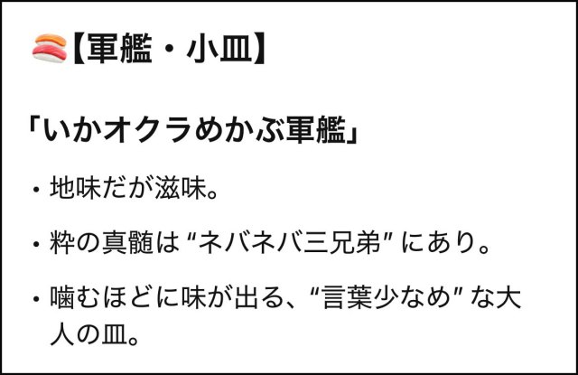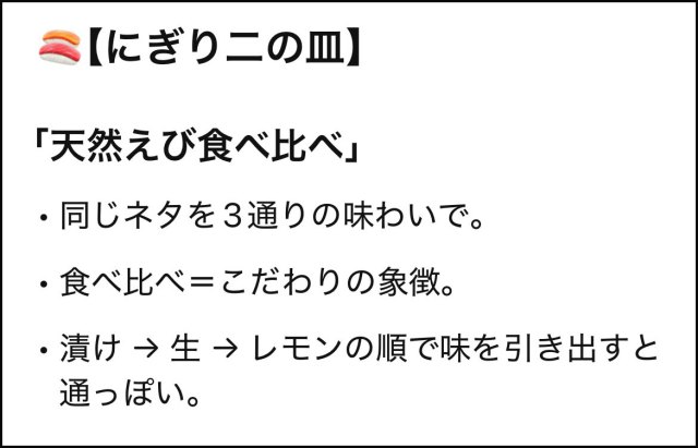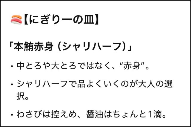 というわけで、AIの「さりげないひとことで通感がアップ」という部分だけは「これ大丈夫?」って感じになってしまったが、少なくとも注文するネタの提案に関しては粋な気がした。