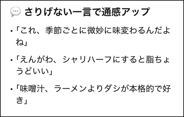 ChatGPTいわく「これ、季節ごとに微妙に味変わるんだよね」といったさりげないひとことで通感がアップするというのだが……こういうことを言ったらぶち壊しじゃないのか?