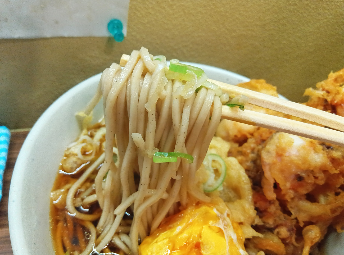 そばを食べてみたところ、特徴を感じたのはつゆ。ひと口飲むともうひと口飲みたくなる奥深い味が、ゲソ天の噛めば噛むほどにじみ出す旨みと非常にマッチしている。