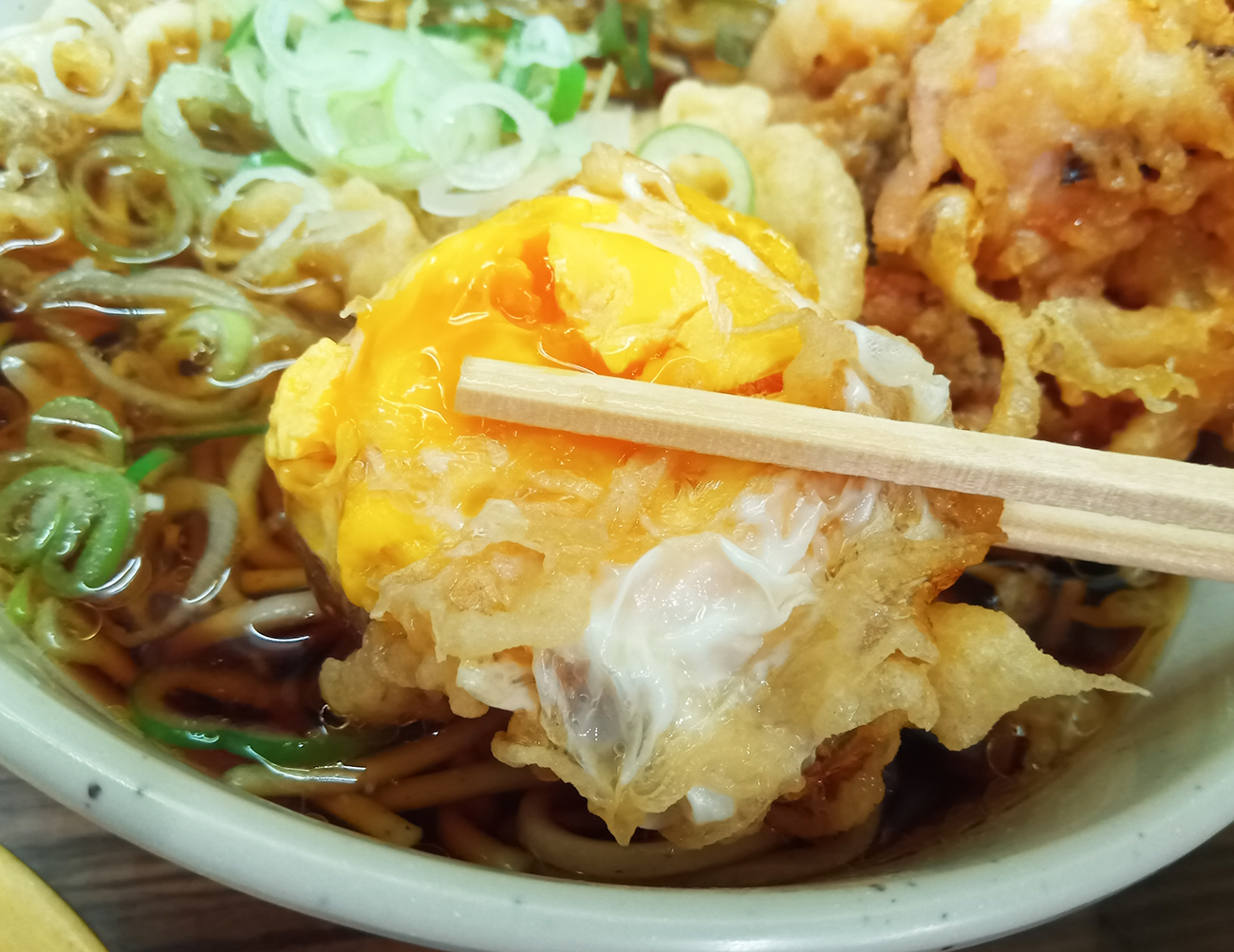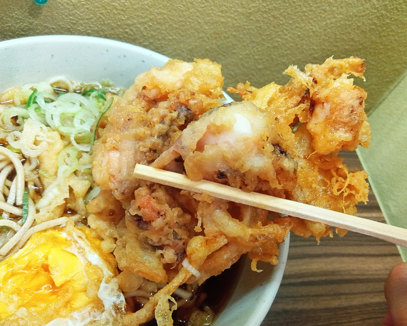 そんな中で、私(中澤)が注文したのは、ゲソ天そばにトッピング玉子天(130円)。存在感のあるゲソ天に彩りを添える玉子天がなかなかお目にかかれない組み合わせだ。