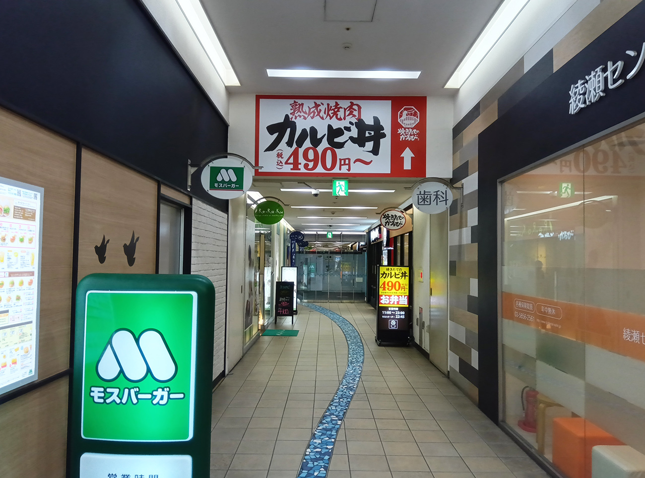 『焼きたてカルビ』の看板が主張しすぎである。通路上の天井の段差みたいなところにバチコーンと貼られていた。微妙に領土を侵犯している気もしないでもないところが良い味を出している。一方で、立ち食いそば屋の霊圧は感じられない。もうすぐ飲食街出ちゃいそうなんですが。と不安になったその時……