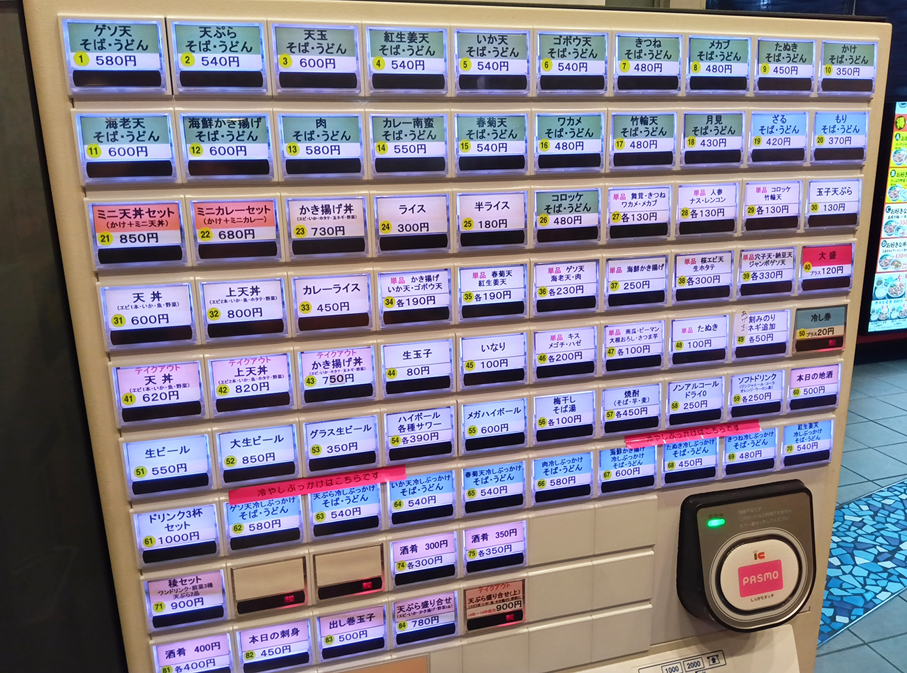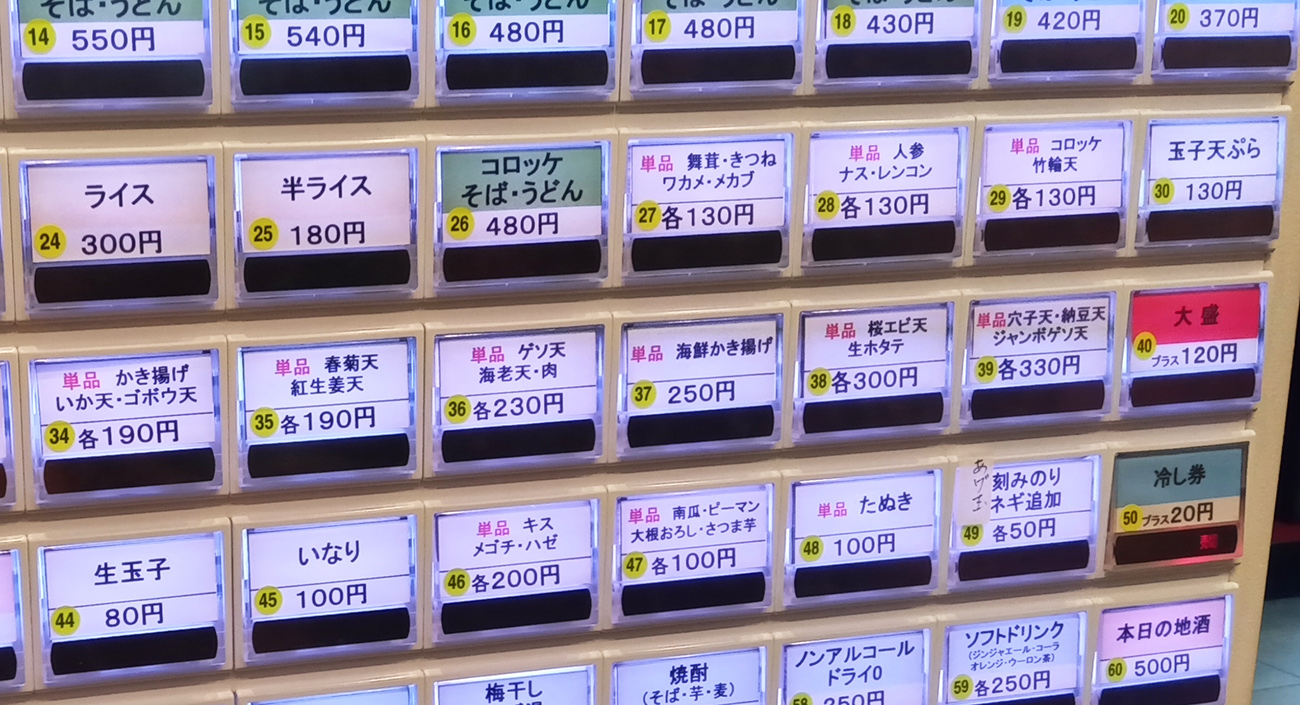 とは言え、中に入ると肩寄せ合って6人くらいは入れそう。まずは、入口前にある券売機を見てみると、最上段の1番左、最初に目に入るボタンは「ゲソ天そば(580円)」だ。ゲソ天そばが店の定番メニューなのかもしれない。それはさて置き……