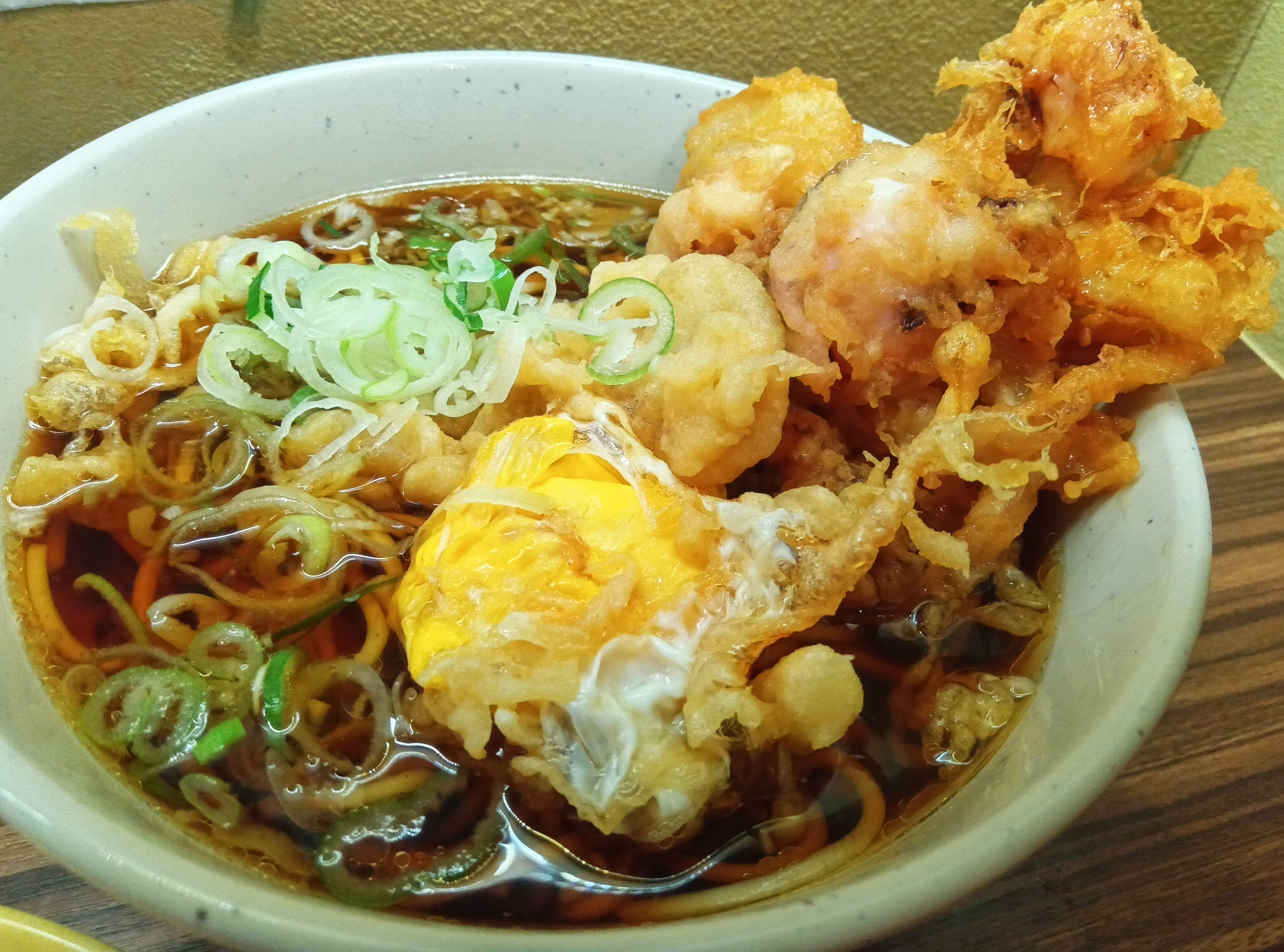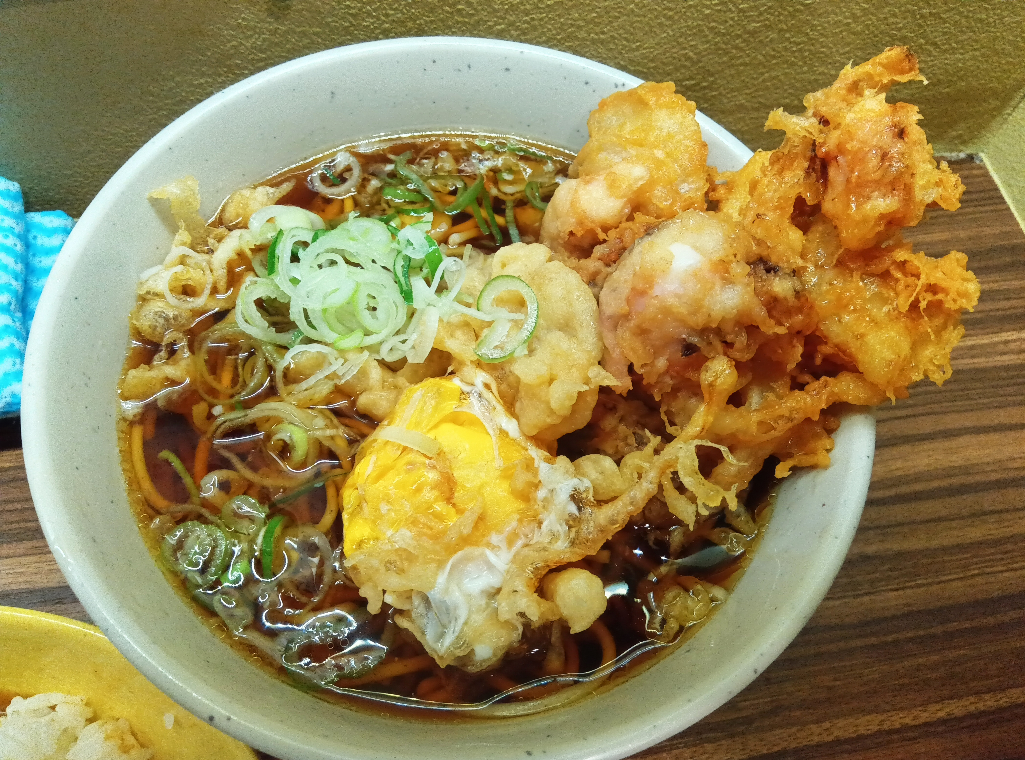 天ぷらの充実度が凄い。かき揚げ天、ゲソ天、春菊天、海老天以外にも、ゴボウ天、ホタテ天、玉子天などまである。天ぷら屋でも玉子天がないところがあると言うのに。