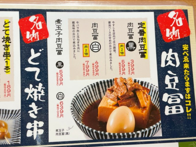 これに合わせるのはもちろん肉豆腐だ。なんでも『黒』と『白』があるらしく、『黒』は醤油ベース、『白』は鰹風味のあっさり出汁とのこと。今回は『黒』をチョイスしようと思うが……