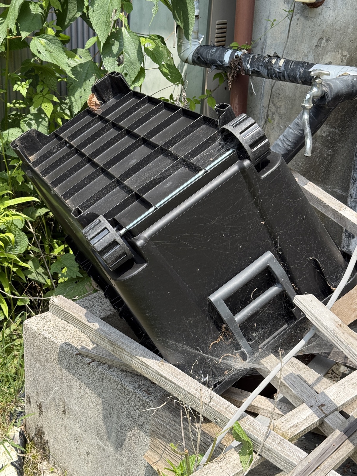 かつてYoshioが「手作り簡易ボイラーでの足湯(露天風呂もやった)」で使った収納ボックスではないか! 蜘蛛の巣が張るほど放置されているとは、もったいない。これを使ってガーデンシンク的な流し台を作ってしまおう。