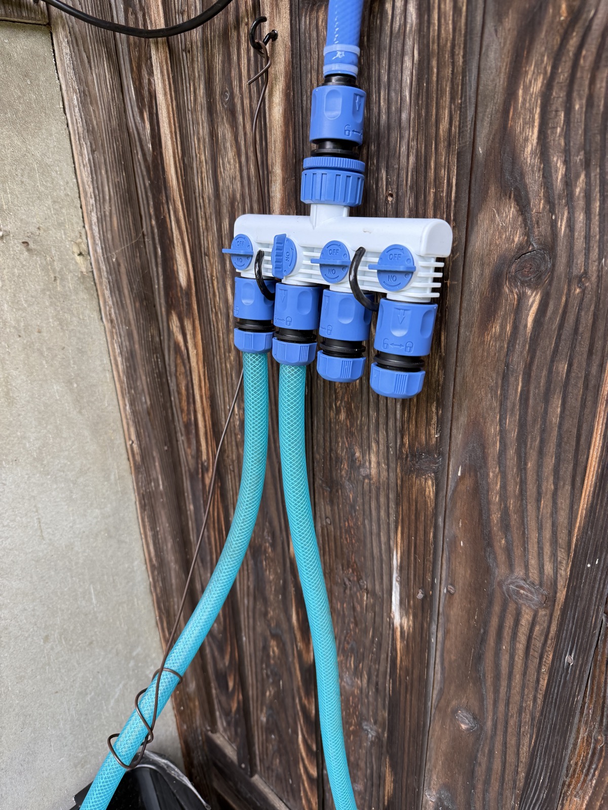 そこで用意したのが、こういったホースの分岐コネクター。将来性を考えて4方向で使い分けようという計画だ。