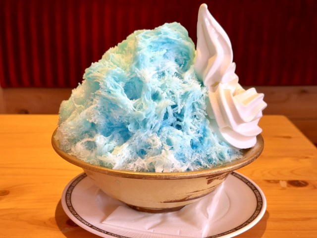恒例の黄金色の容器で到着! スカイブルーの氷が輝いている!! 相変わらず天高くそびえるソフトクリームのタワーは圧巻だ。見ているだけでヒヤリとしてくる。