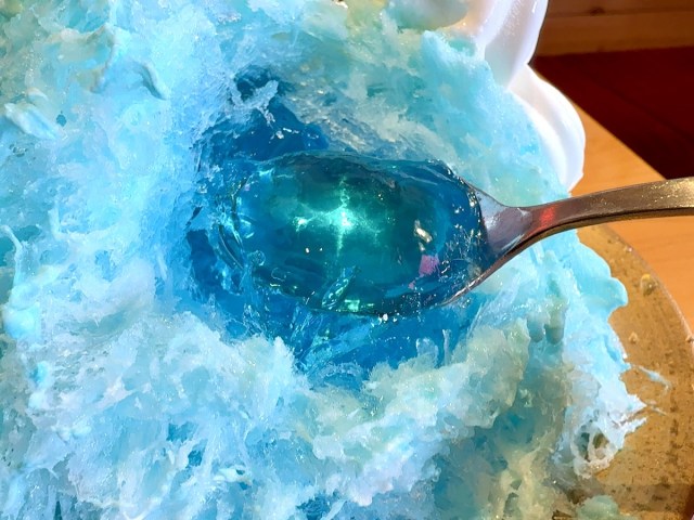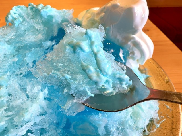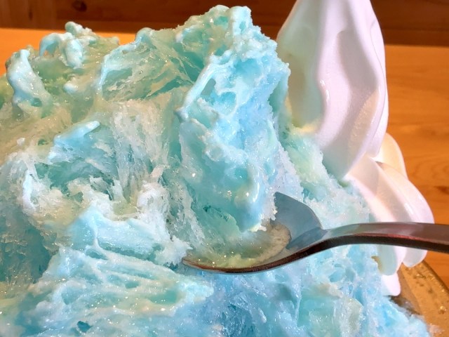 シロップは爽やかなラムネ風味。わずかに酸味がありつつも、練乳やソフトクリームとも違和感なくマッチする。筆者は中年となった現在でも普通にクッピーラムネ(菓子のほう)を買って食べるほど子ども舌なので、かなり好きな味だ。