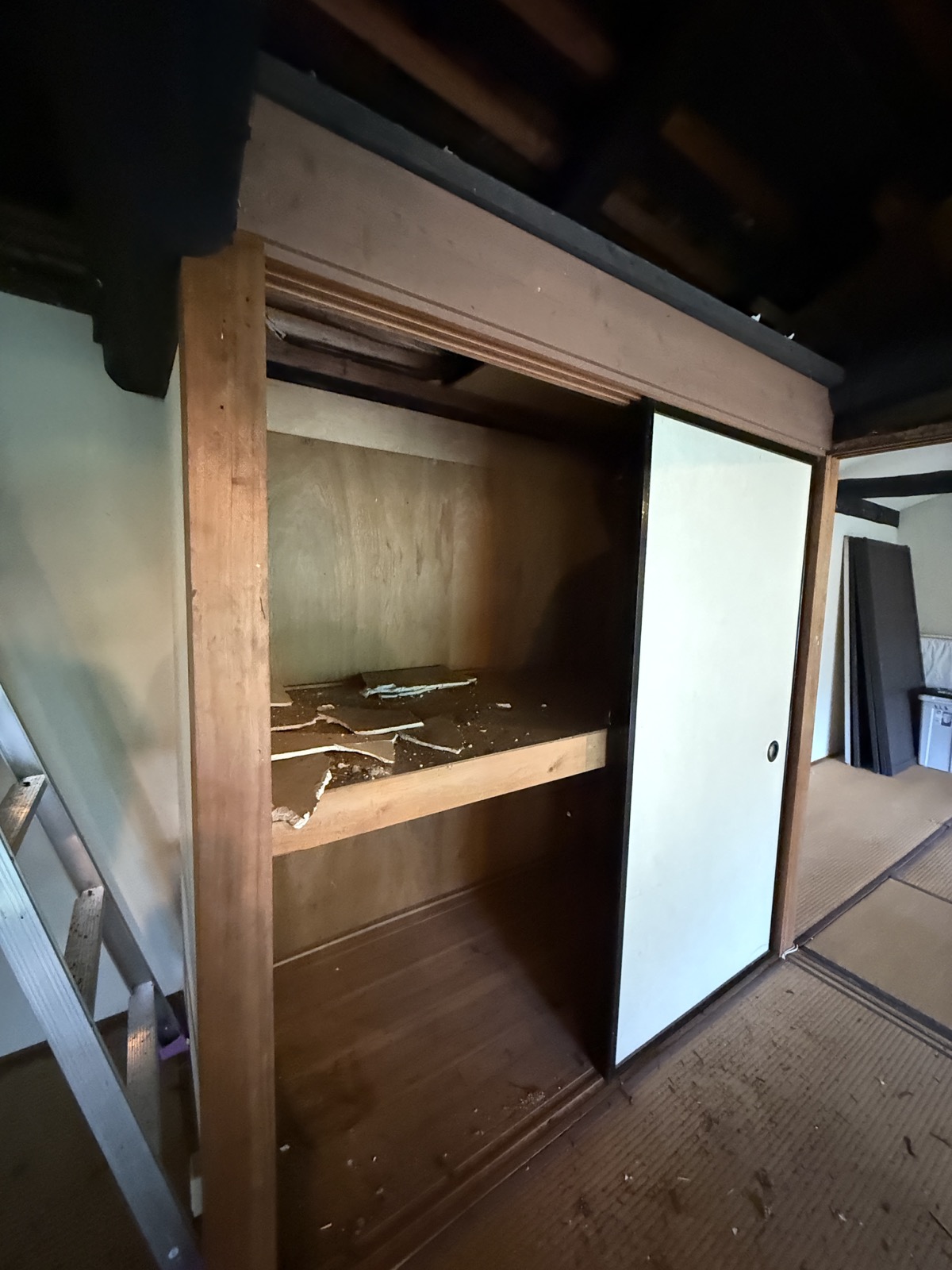 こうなるともうめんどくさい。押し入れの天井なんて不要なのでは……となってしまうのが私の性格。天井抜いたら、押し入れの上の隙間へのケアもしやすくなるし……ということで抜いてみることにした。