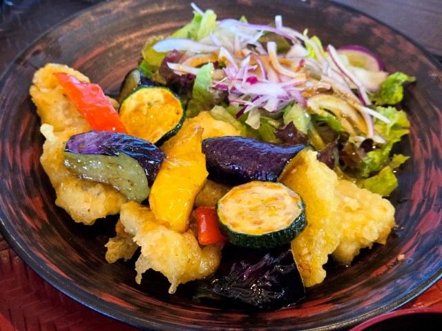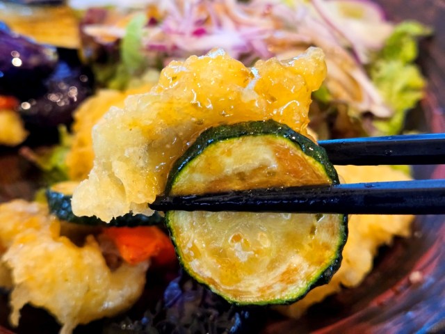 夏野菜は、パプリカ、ズッキーニ、ナス。揚げたてふわふわの鱧は、たっぷり6切れも入っている。