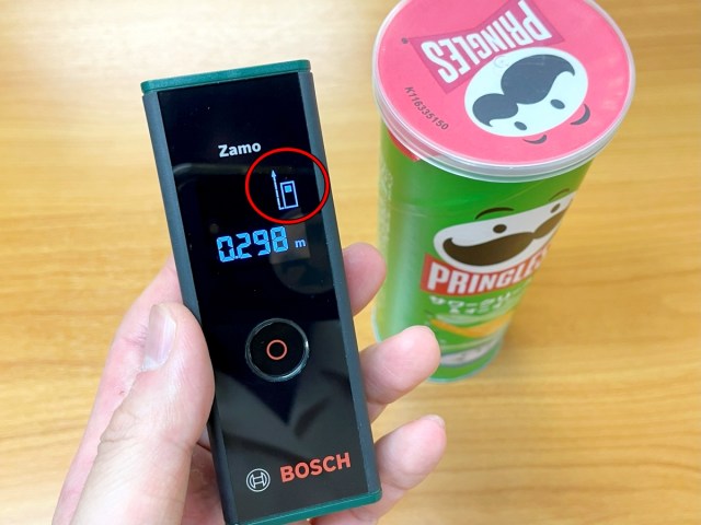 使用するのは、過去にも何度か登場したボッシュのレーザー距離計『ZAMO3』だ。本体上部からレーザーを照射し、対象物までの距離を瞬時に計測する機器である。
