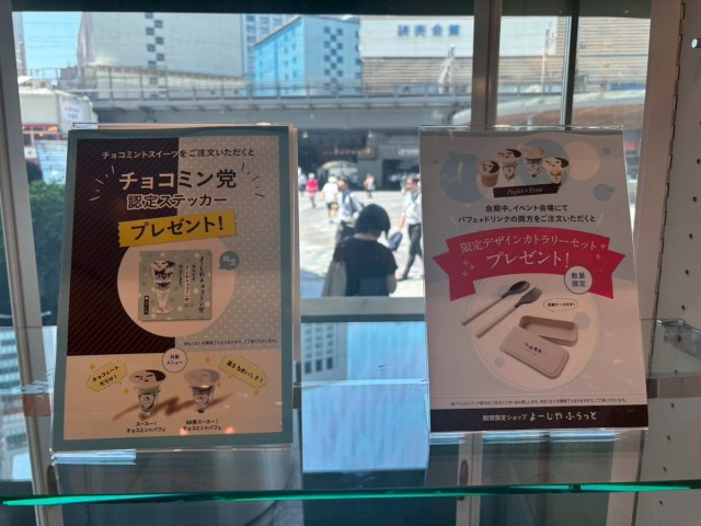 チョコミントスイーツを注文すると「チョコミン党認定ステッカー」がもらえたり、物販で3000円以上の購入で「入浴料」や「スキンケアのサンプル」などもついてくる。