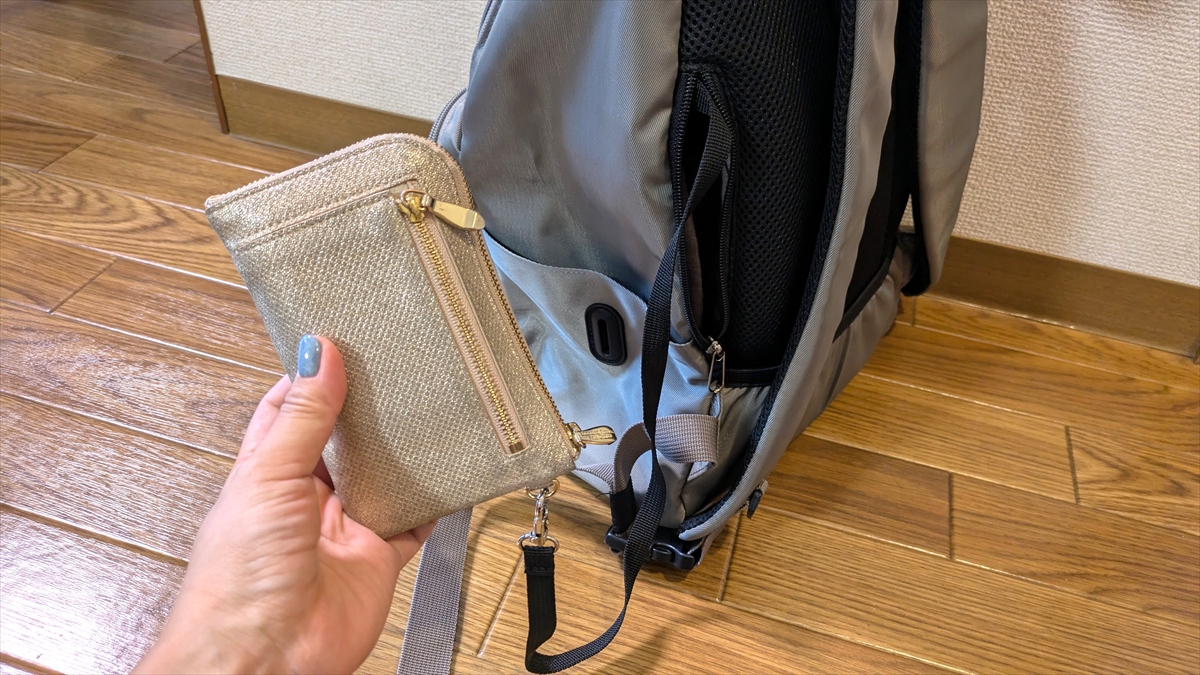 サイドの小さなファスナーから、背負ったまま片手で取り出せるので便利そうだ。筆者の場合は財布を付けてみた。
