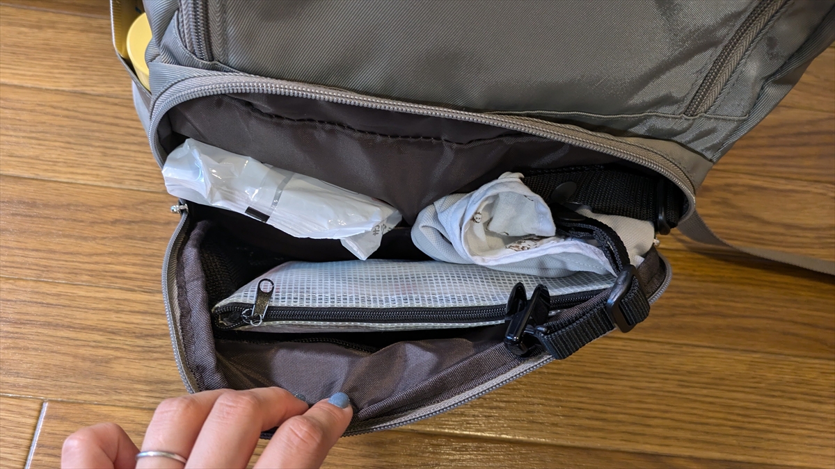 荷物を詰めてしまうと、財布が何かに引っかかってうまく引っ張り出すことができない。コレを活用するにはもっと荷物を減らす必要があるな。