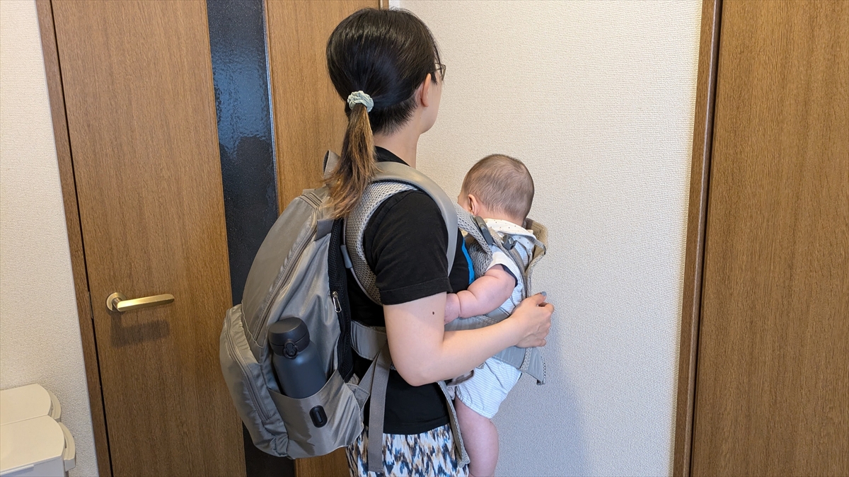 今度はこのリュックを、子どもを抱っこした状態で背負ってみる。