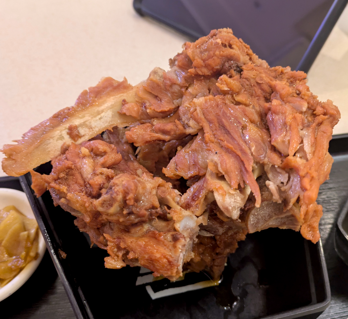 排骨はどれがいいんだろうか? 写真を手掛かりに考えた結果、「爆款犟骨头套餐」(税込1050円)ってヤツを頼んだ。これまた後にGEMINIに翻訳してもらうと「大人気特製骨付き肉定食」といったニュアンスのメニューとのこと。