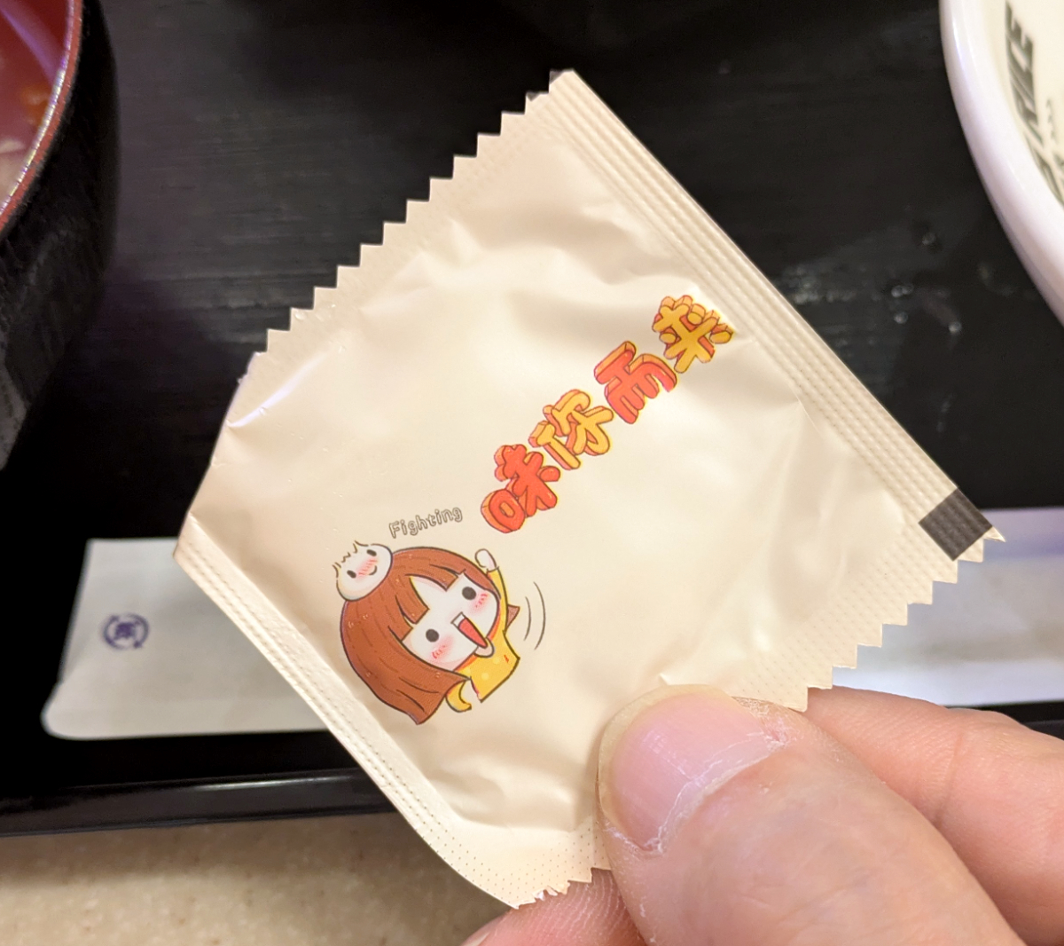 これを手づかみで食べるらしいんだけど、さすがに素手ではないよなあ。卓上にビニール手袋は見当たらないんだが、ひょっとしてコレかな?