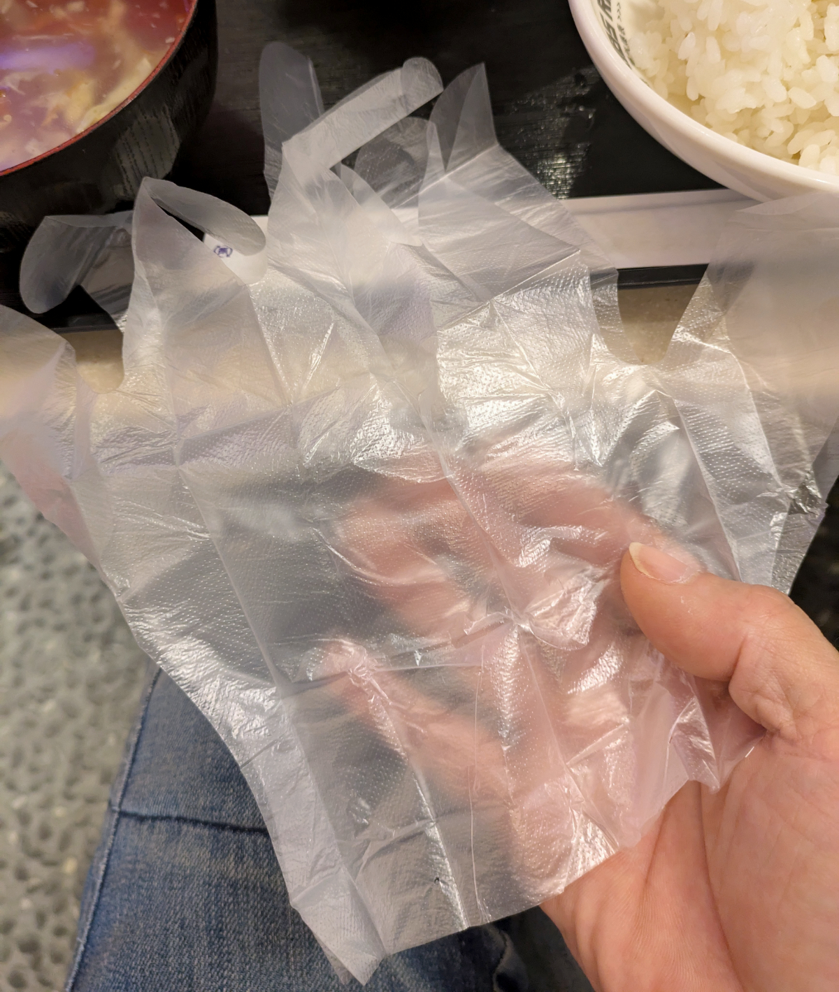 中身を取り出して広げてみると……手袋になった! 今のビニール手袋ってこんなにちっちゃくなってるんだね。かさばらないし、場所をとらないので飲食店では重宝しそう。
