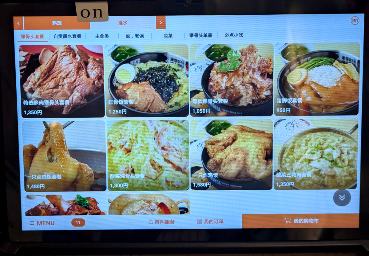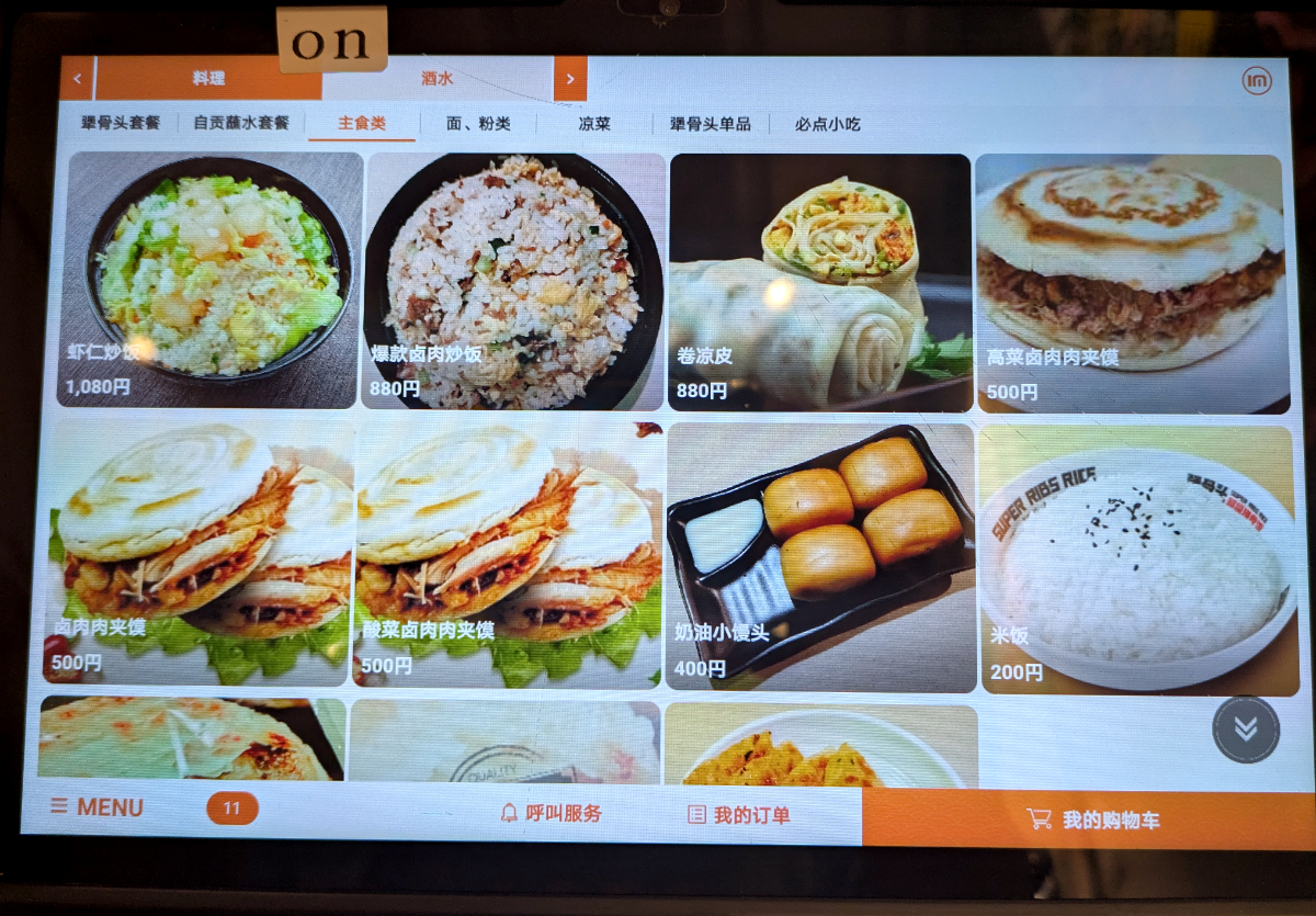店内にはたぶん日本語メニューもあるだろう……と、思ったが甘かった。タブレット端末を見ると日本語がない。言語の変更もできない(オーダー後にできると気づきました……)。やっぱり写真で予想するしかないな~。