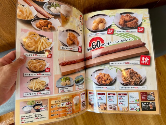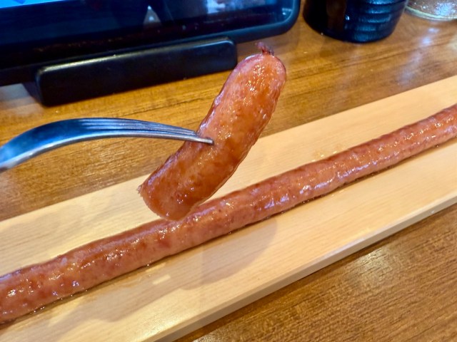 越乃黄金豚を頼むかどうか悩んでいたところで、まさかの極長ロングソーセージが登場……マジかよ聞いてねえぞ。