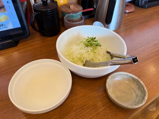 ちなみにご飯・味噌汁(豚汁か赤出汁味噌汁)・キャベツ・お新香は食べ放題らしい。
