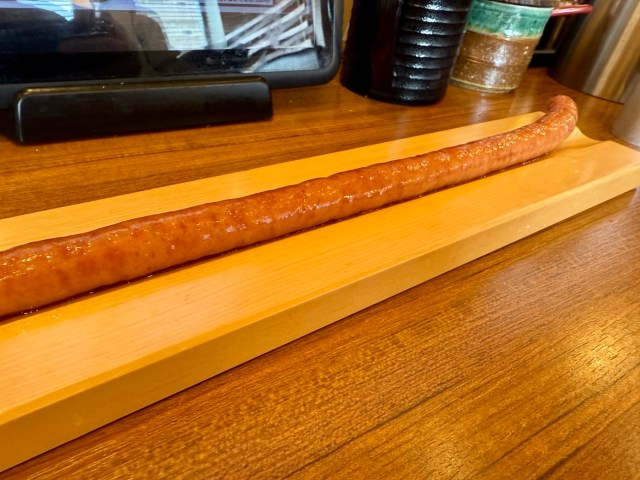 越乃黄金豚も泣いて逃げ出すほどの圧倒的存在感。カウンター席1人分のスペースにギリギリ収まる長さだった。隣の席から「ランチタイムにロングソーセージ頼むバカいるかよ……」という冷たい視線を感じる。分かる、でも頼んでしまったのだ。