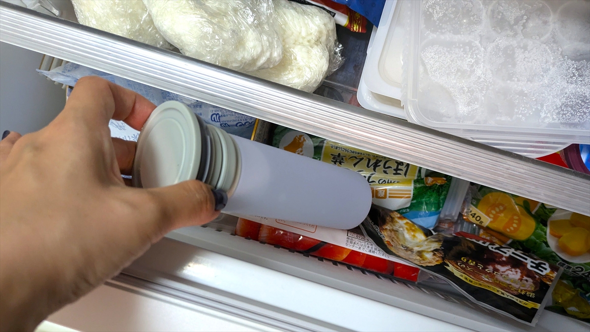 縦にした状態で冷凍庫へイン! そのまま一晩凍らせれば……