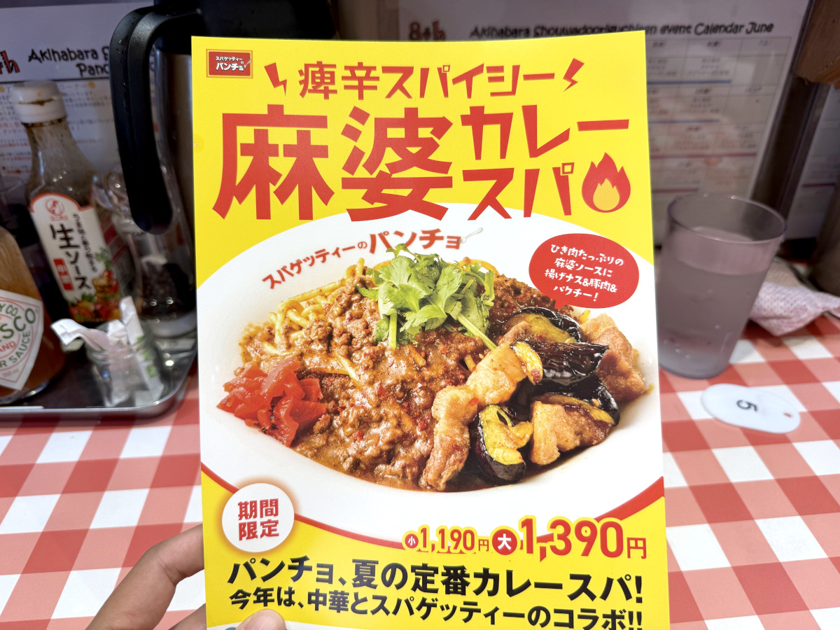 それはさておき、夏本番に先駆けて我らが「スパゲッティーのパンチョ」から今年もカレー系の期間限定メニューが登場した。その名も『痺辛スパイシー! 麻婆カレースパ(小1190円 / 大1390円)』なのだが、ちょっと今回は厳しめにジャッジさせていただきたい。
