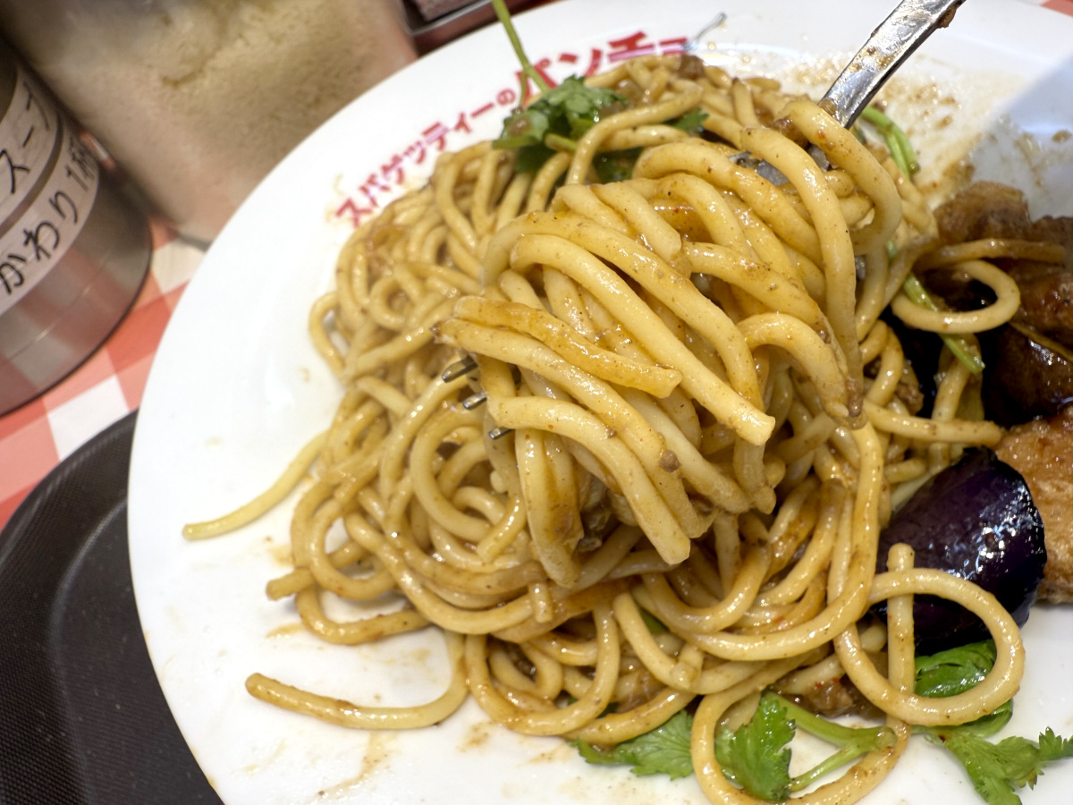 そして何より「致命的じゃないか?」と感じたのは、ナポリタンの方が遥かにインパクトが強かったこと。ナポリタンと比較すると麻婆カレースパは「優しい味付け」という印象である。