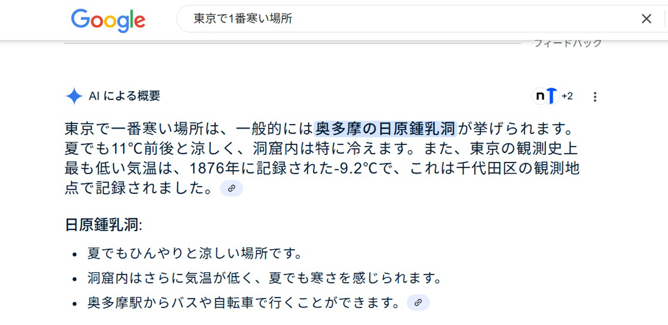 「東京で一番寒い場所は、一般的には奥多摩の日原鍾乳洞が挙げられます。夏でも11℃前後と涼しく、洞窟内は特に冷えます」