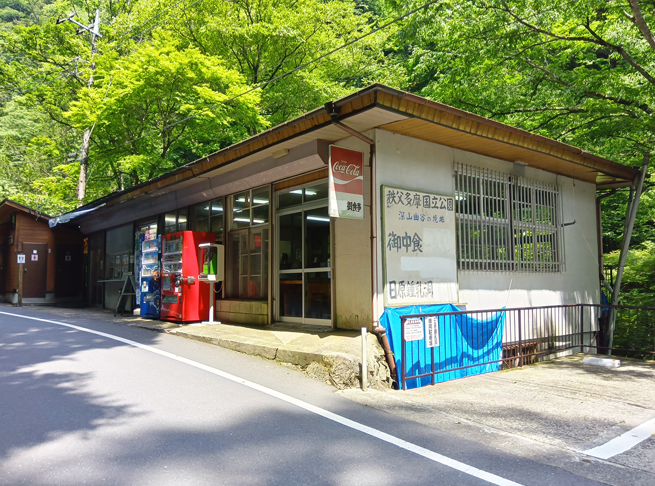 その休憩所兼売店を越えたところに日原鍾乳洞の看板があったのだが……