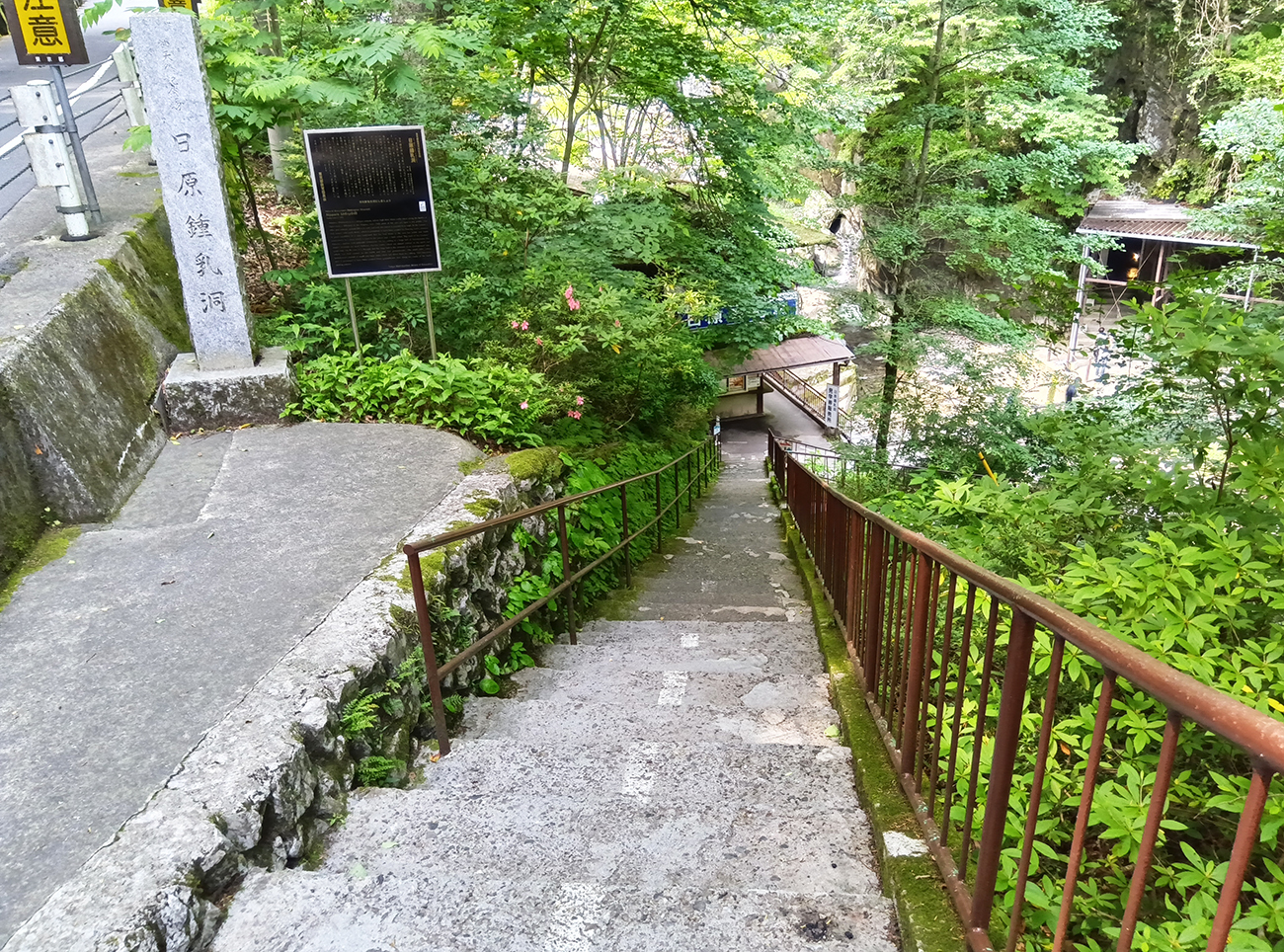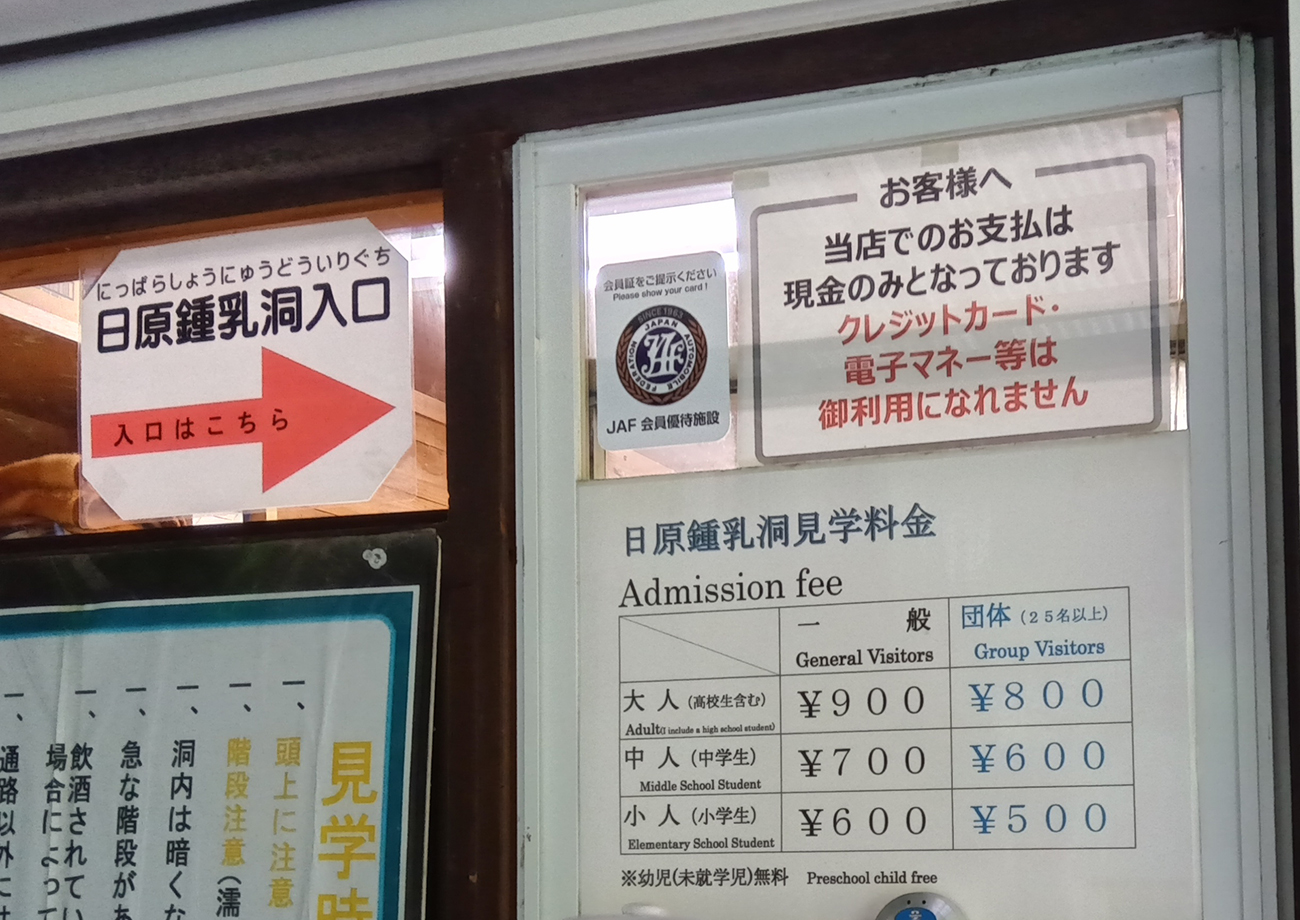 看板があるくらいなので、そこからすぐのところに鍾乳洞入口に降りる階段があった。受付があって見学料金は900円。午前9時~午後5時までバリバリ営業中である。