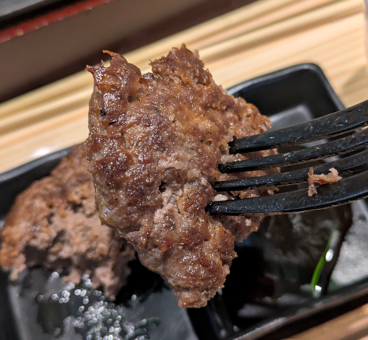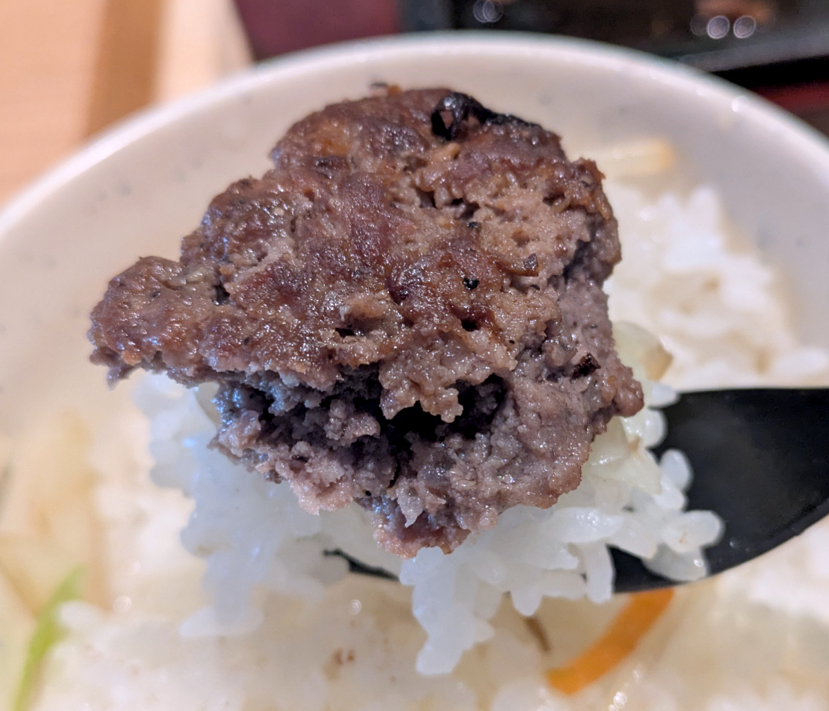 ではさっそく頂きましょう。ハンバーグにはあらかじめソースがかかっているのでそのまま食べてもいいし、卓上のステーキソースや塩を活用して、味変してもいいだろう。