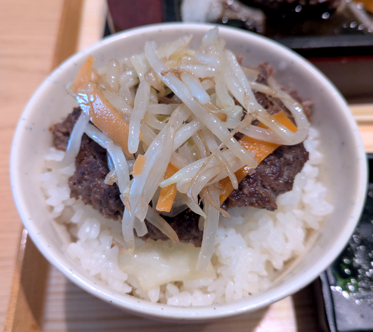 当然ご飯に乗せるよね。主役はハンバーグだけど、付け合わせのもやしもうまいのです。ニンニクの風味が効いていて、これだけでもご飯が進む。2つを乗せて、即席のハンバーグ丼ですわ。