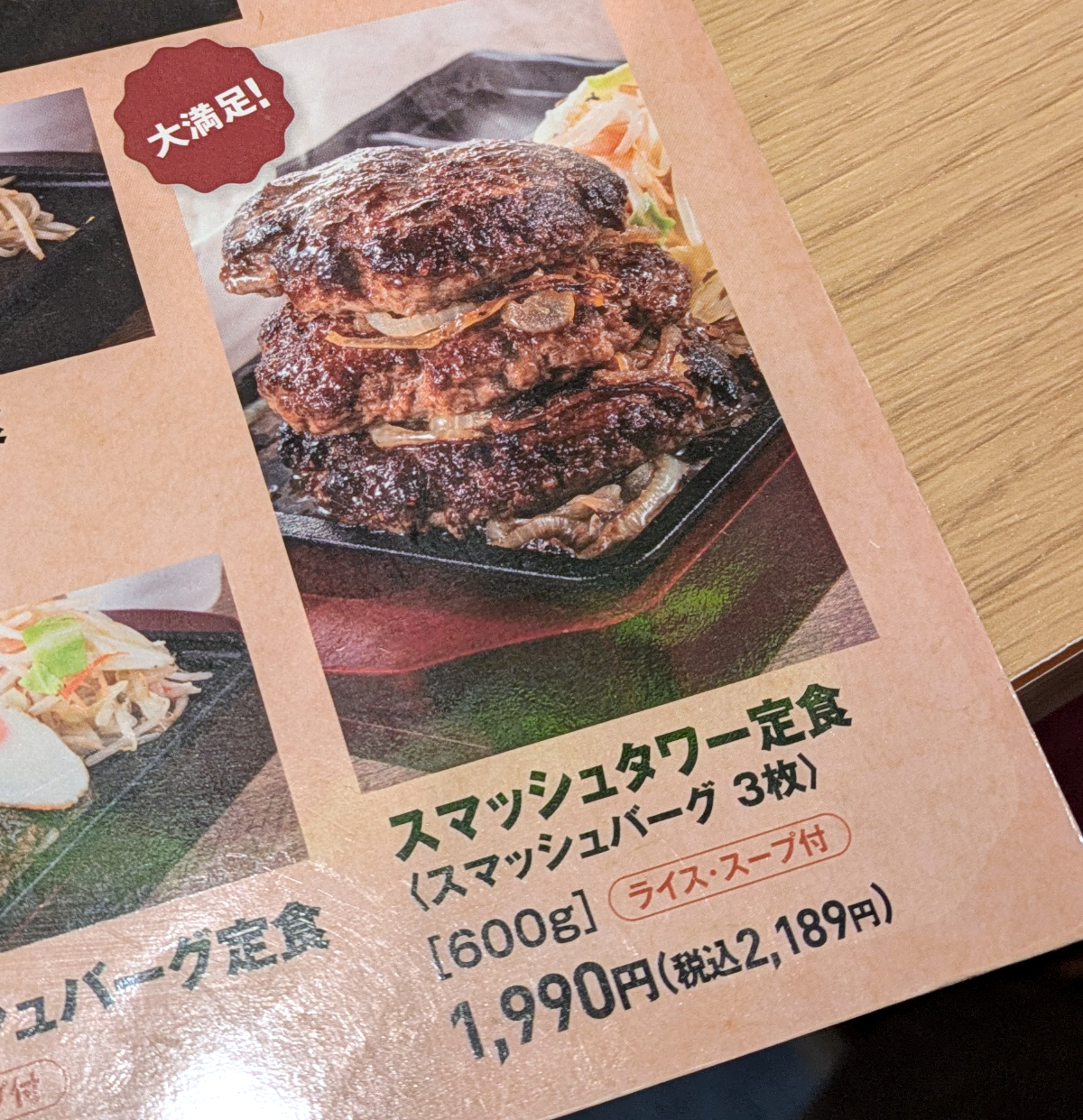下の方を見ると、ハンバーグ3段重ねのデカ盛り風のメニューを発見。こんなのあったっけ? 「スマッシュタワー定食」(税込2189円)か、よしこれにしよう、久々にガッツリ食うか!