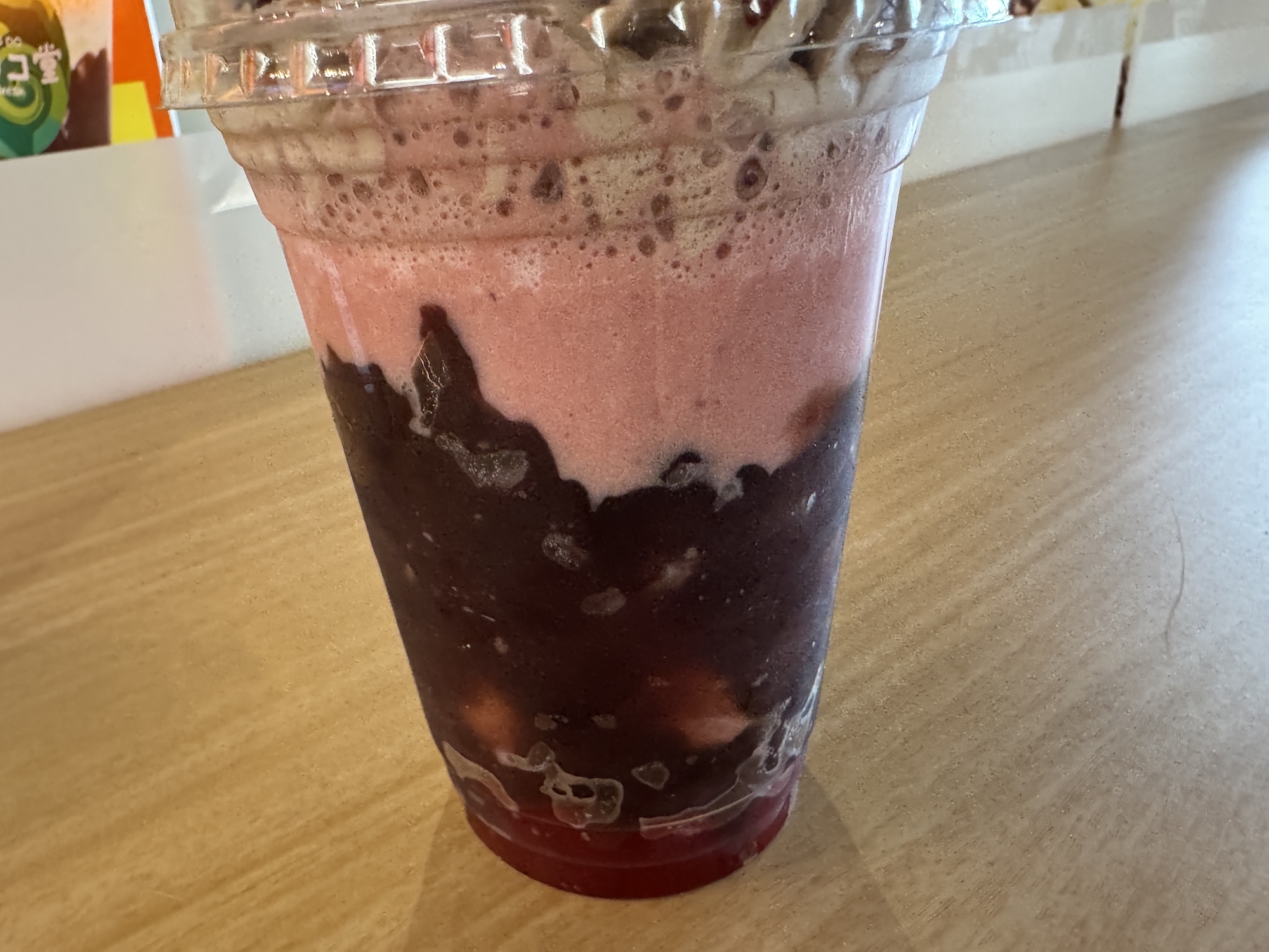 「ストロベリージェリー&いちごバナナミルクにチョコホイップを乗っけ、トッピングに小倉あん、甘さはふつう」のMサイズ(790円)!