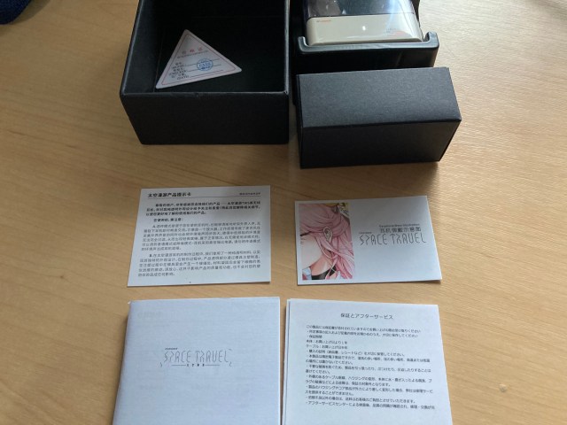 中には本体、充電ケーブルと予備のイヤピースが入った小箱。あと書物だね。