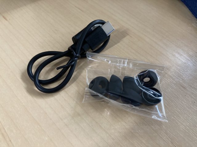 短い充電ケーブルとイヤーピース。ちなみに本体はUSB-Cを使っている。