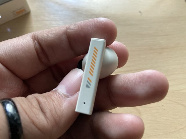 背面の棒部分にはマイクの穴と、オレンジ色の線があるところにはタッチセンサーがある。