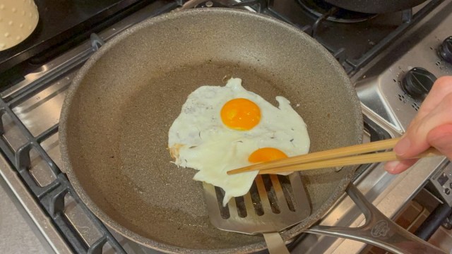あとはいつものお皿に……と思いきや、ここも意外と難しい。二つの黄身の指揮をとる難しさに、またもや双子育児を重ねつつ、すかさず菜箸を投入した。