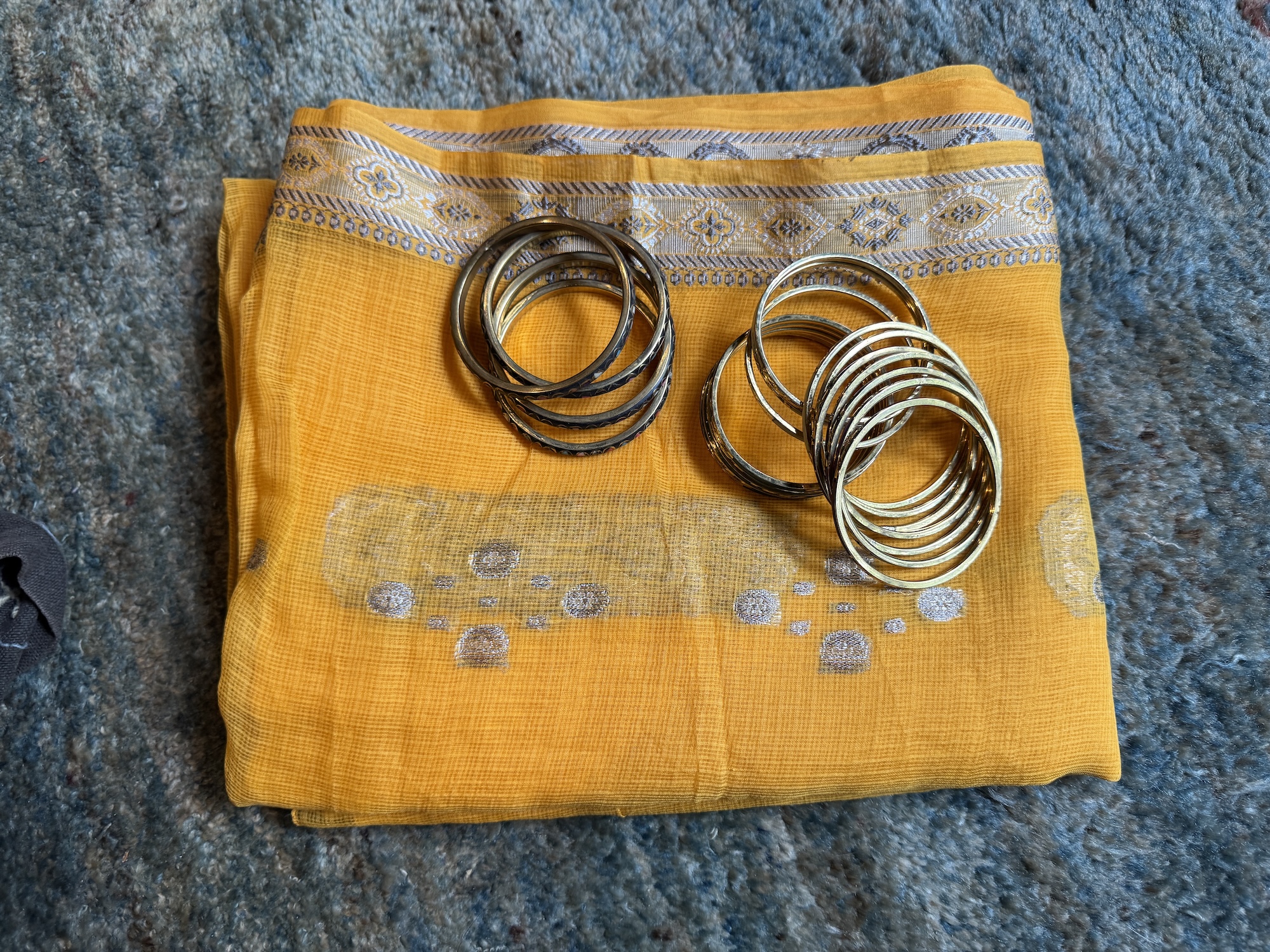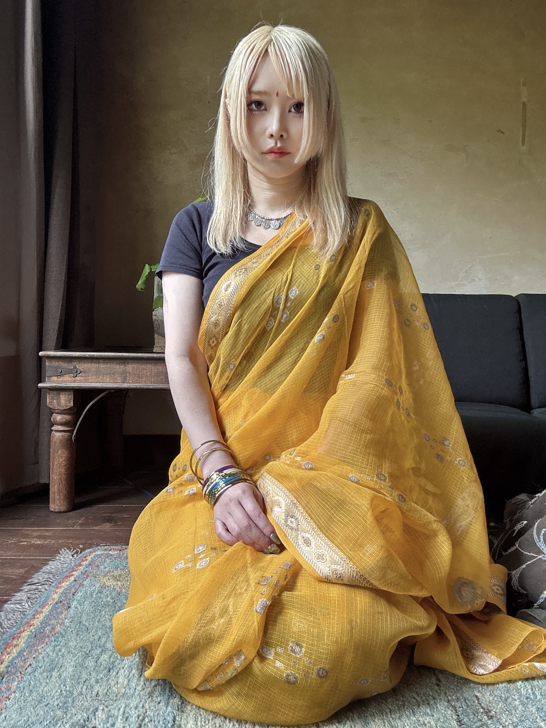 幸いウチにはインドの民族衣装『サリー』とインドで買ったアクセサリーがあるので着用。前回はビール片手に撮影したが、インドは宗教上の理由から酒はダメな可能性がある。なので花を持ってみましたよ。花NGな国はさすがに無いでしょう。