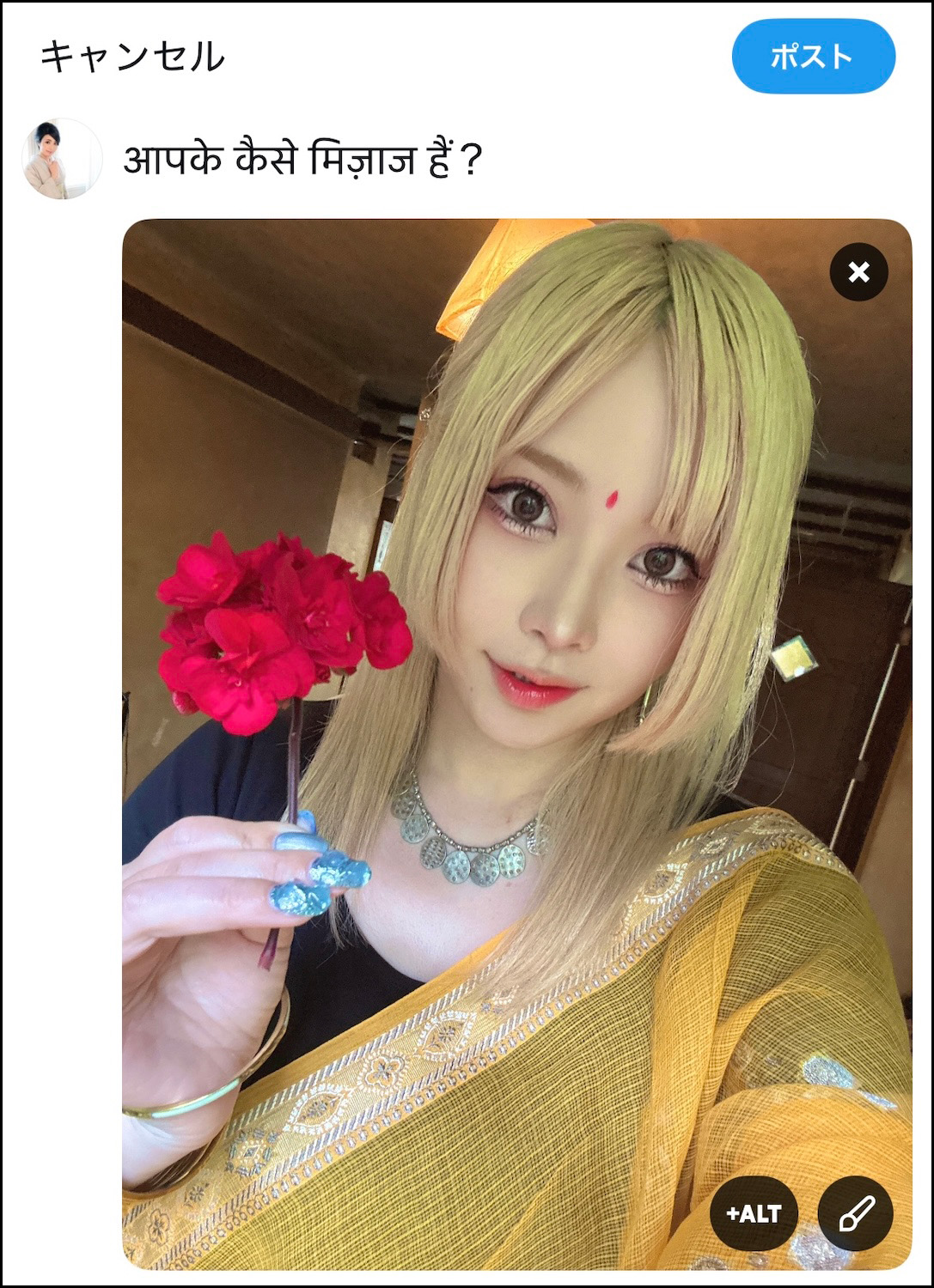 そうと決まれば、さっそくポスト用の自撮りをする。前回は「何てことのないポストがブーストでどこまで伸びるか」を検証したが、今回はインドがターゲットのため過去のデータが一切通用しない。ならばいっそ “インド人に媚びまくったポスト” を作成しよう。