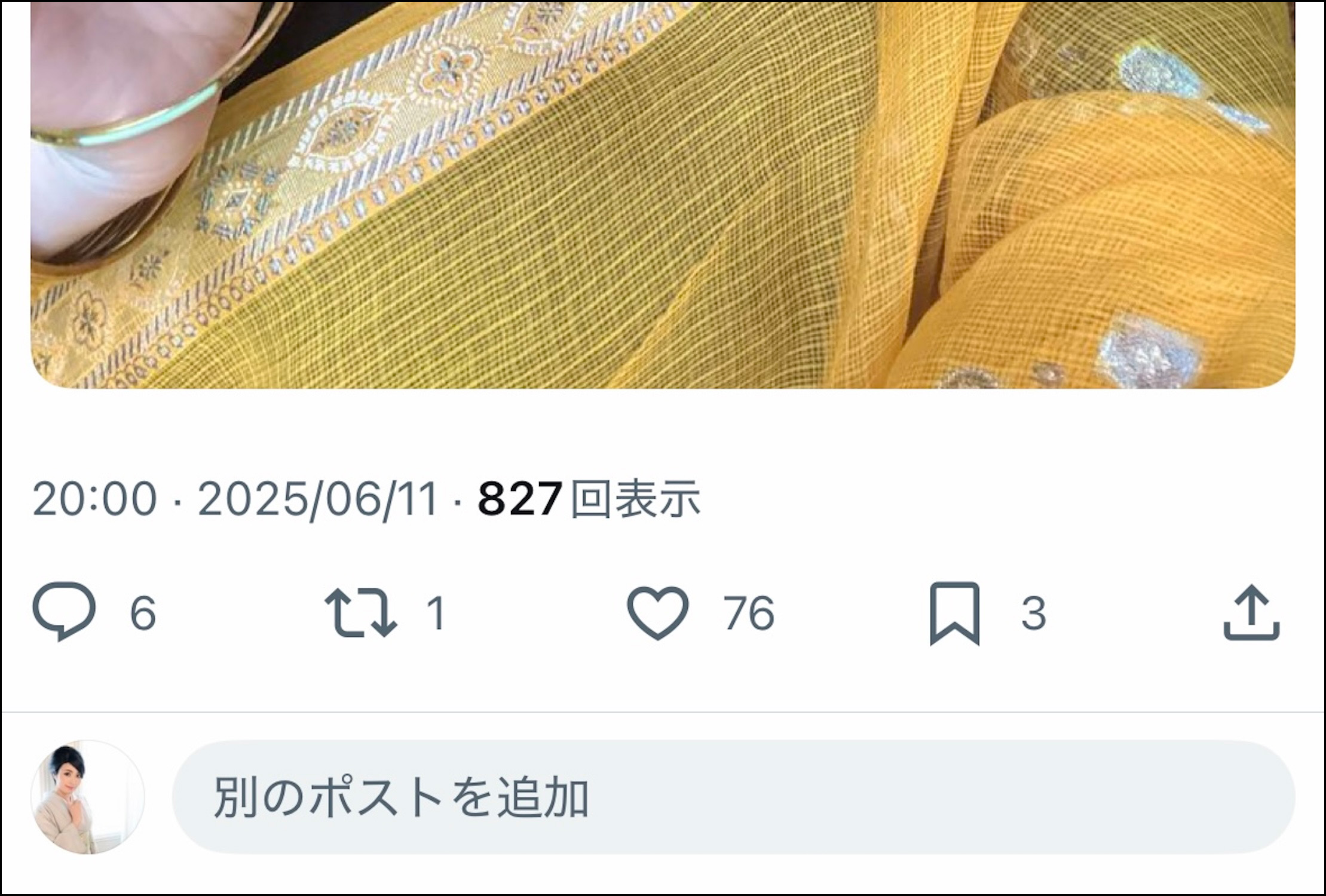 投稿から20分……ポストは「827インプレッション・76いいね・6コメント」を獲得した。この段階ではまだブーストしていないため、主に私のフォロワーさんがポストを見てくれた数字である。