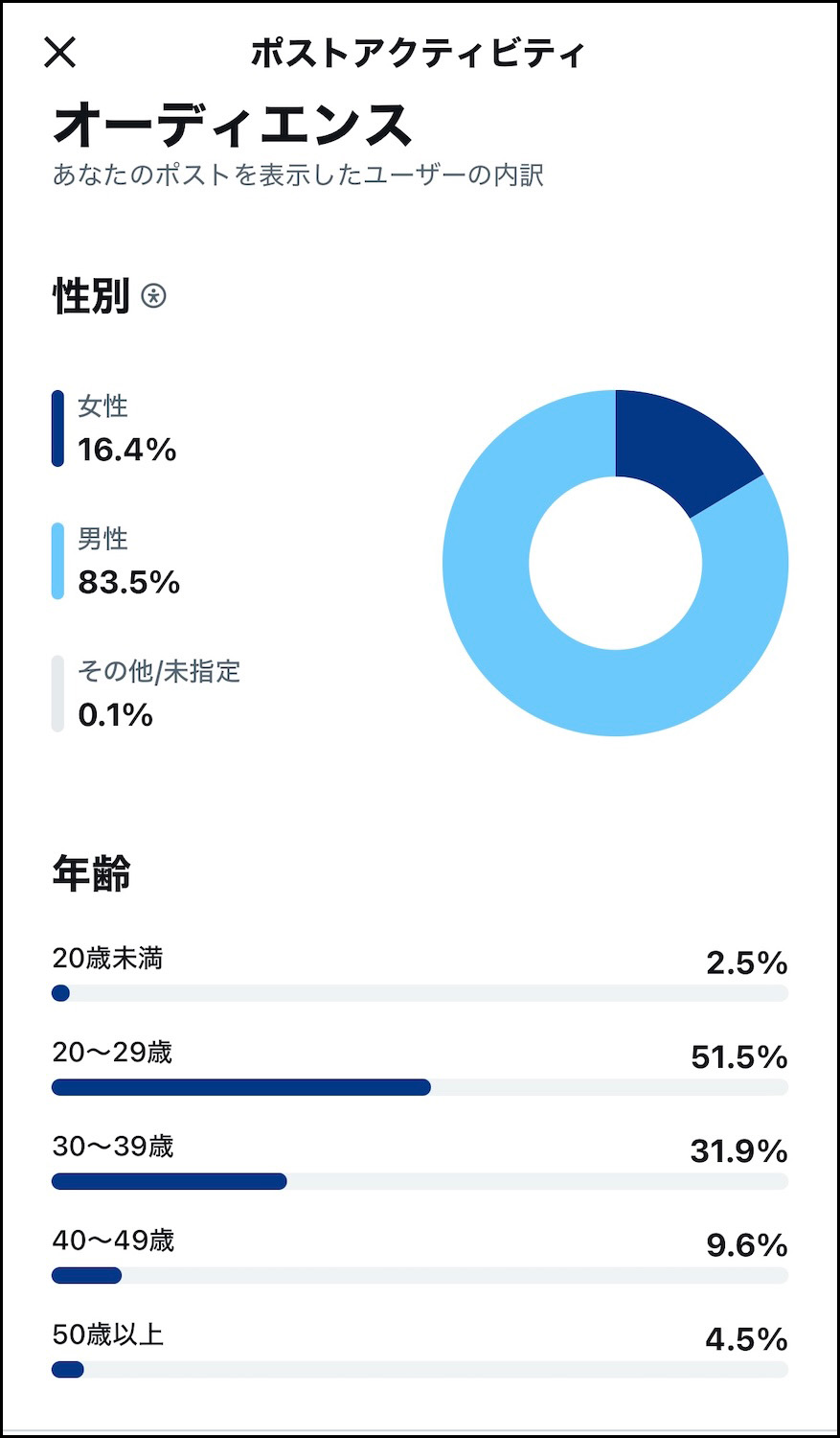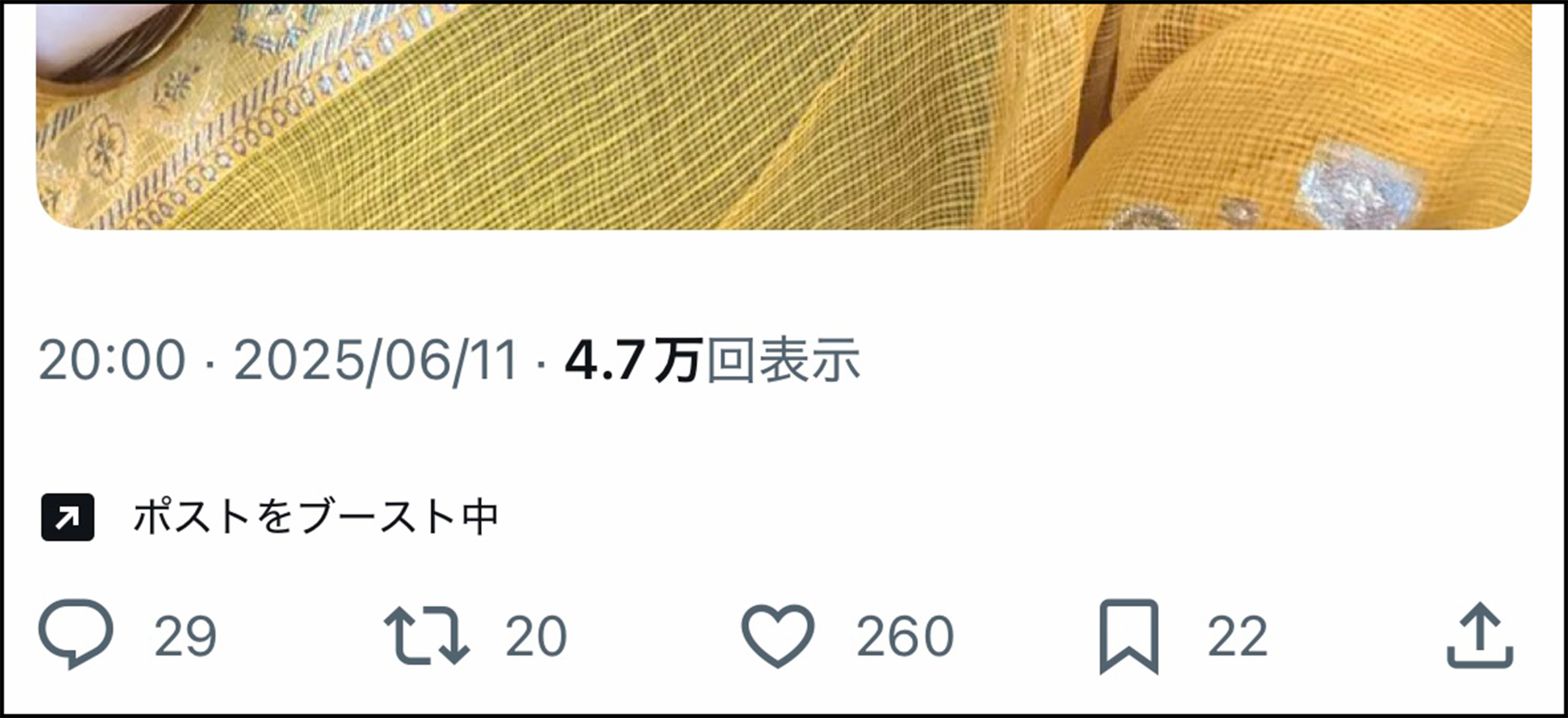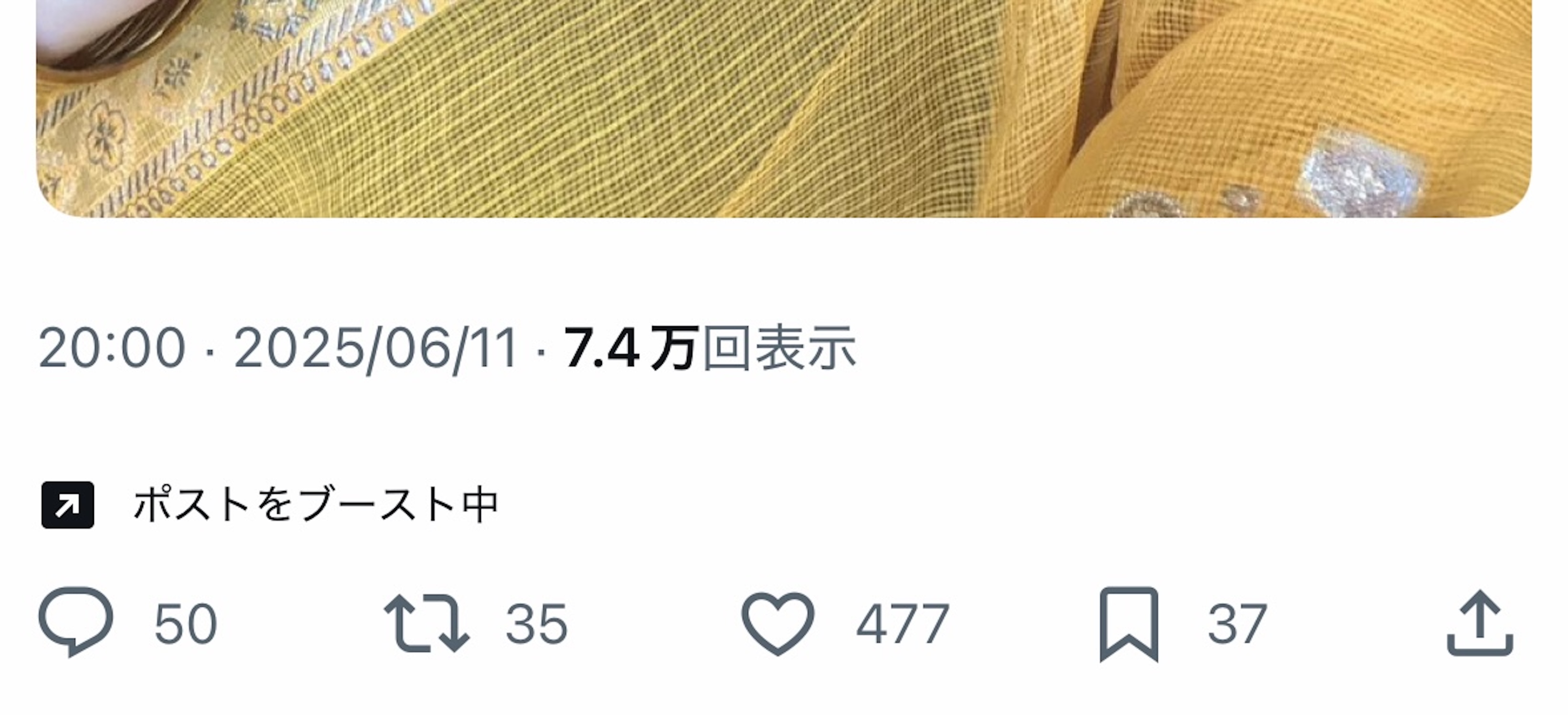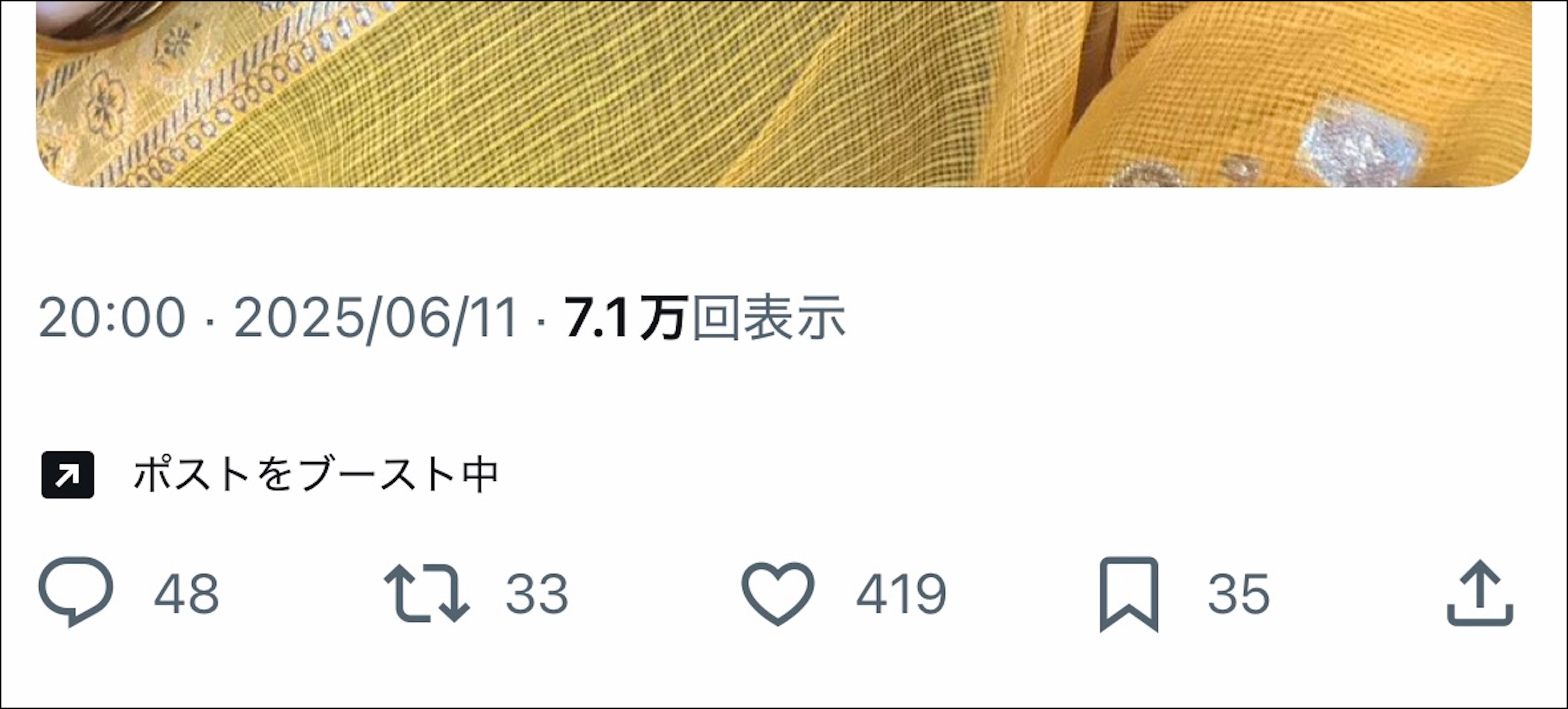 X上ではこのポストのアクティビティを確認することができる。前回と同じ仕組みなら、ここにある「◯◯%」というのは “数字のうち、ブーストによって得られた割合” を表しているはず。