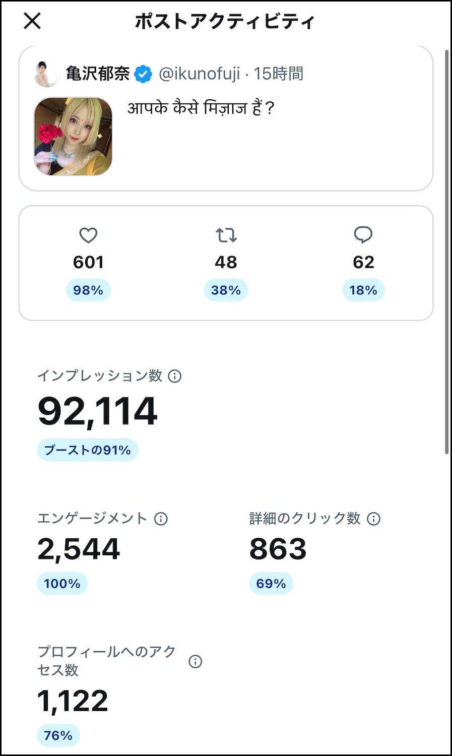 なお全てがブースト経由かどうかは分からないが、この半日で増えたフォロワーは20人。インドで認知されることにどんなメリットがあるのかは一旦置いといて、想定の5〜15倍ほどのリーチ数があったとなると、インドブースト大作戦は限りなく「大成功」に近いといえよう。