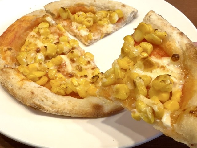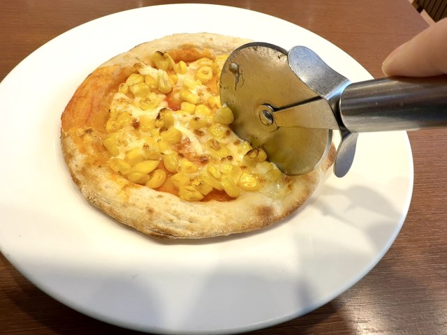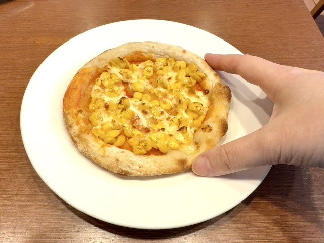 2品目には「ちょいピザマヨコーン」をチョイス。直径約13cmと手のひらサイズで、ベーカリーで売っているひとり用ピザくらいのボリューム。サイドメニューとしては十分だろう。