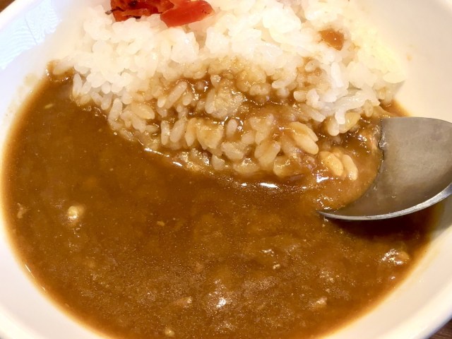 ご飯ものとして、新しく加わった「ミニカレー」をセレクトしてみた。同店でコラボ展開中のゴーゴーカレーとは違う、レギュラータイプともいえるカレールウ。