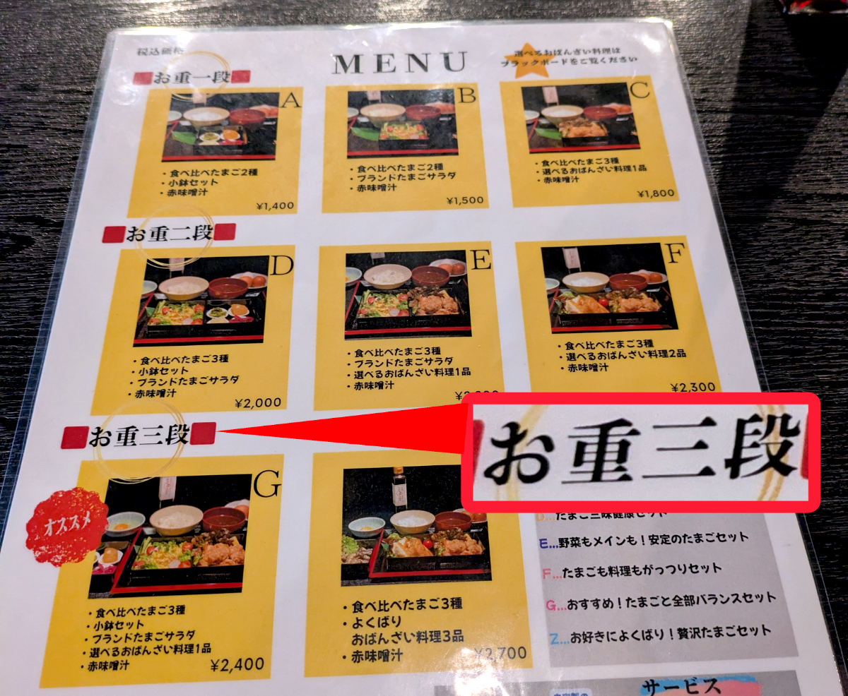 さて、メニューを見ると、全部お重で出てくるようだ。もっともシンプルなたまご食べ比べ2種に小鉢セットと赤味噌汁の付くお重が税込1400円。高い方だと、たまご3種とおばんざい3品、赤味噌汁がつく三段のお重が税込2700円となっている。