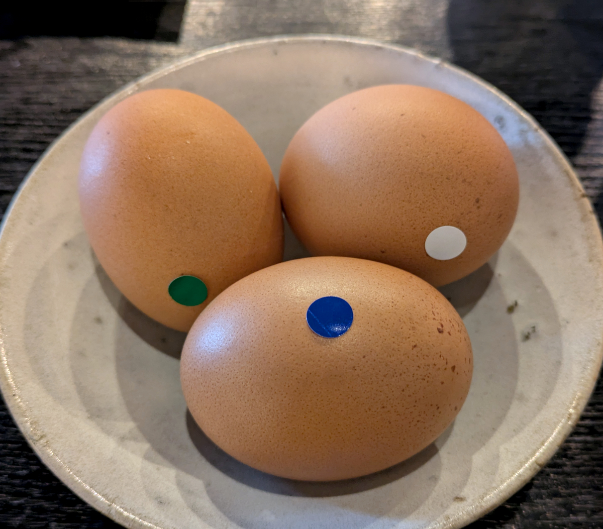たまごは外見の違いが乏しいので、自分でシールを貼って目印にするそうなのだが、私はシールを貼ったにも関わらず、どれを取ったか曖昧になってしまった。多分、アレとアレとアレのはず……。