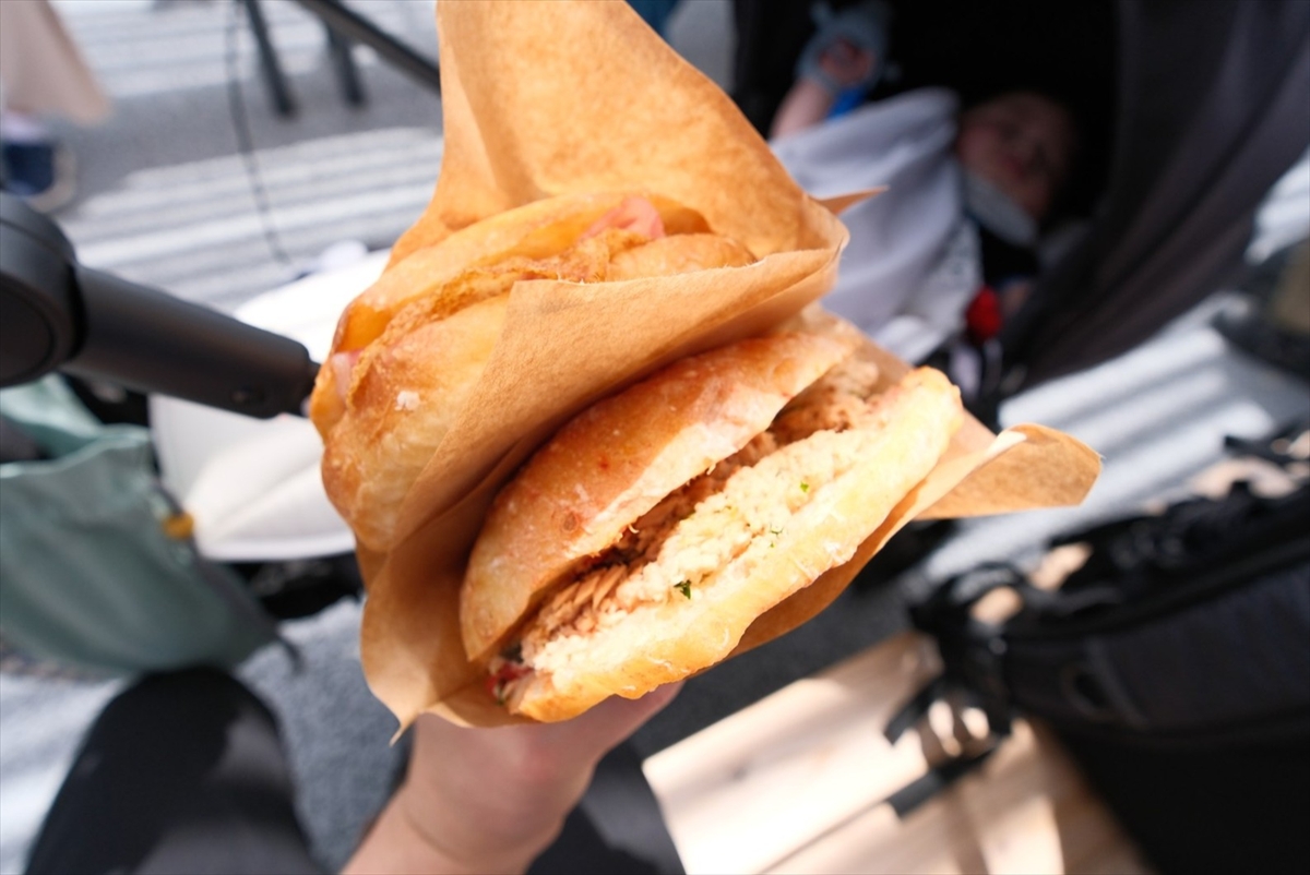 万博ではサンドイッチのように具材を挟んだものが提供されていて、『ツナ、オリーブ、ケッパーのフティーラ』と『ベーコンと卵のフティーラ』を注文。お値段はどちらも税込1700円だ。